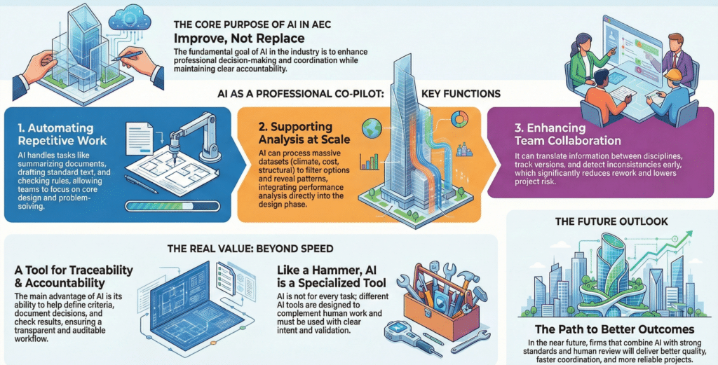 In AEC, the purpose of AI is not to replace architects or engineers. The purpose is to improve decision-making and coordination, while keeping clear responsibility.
