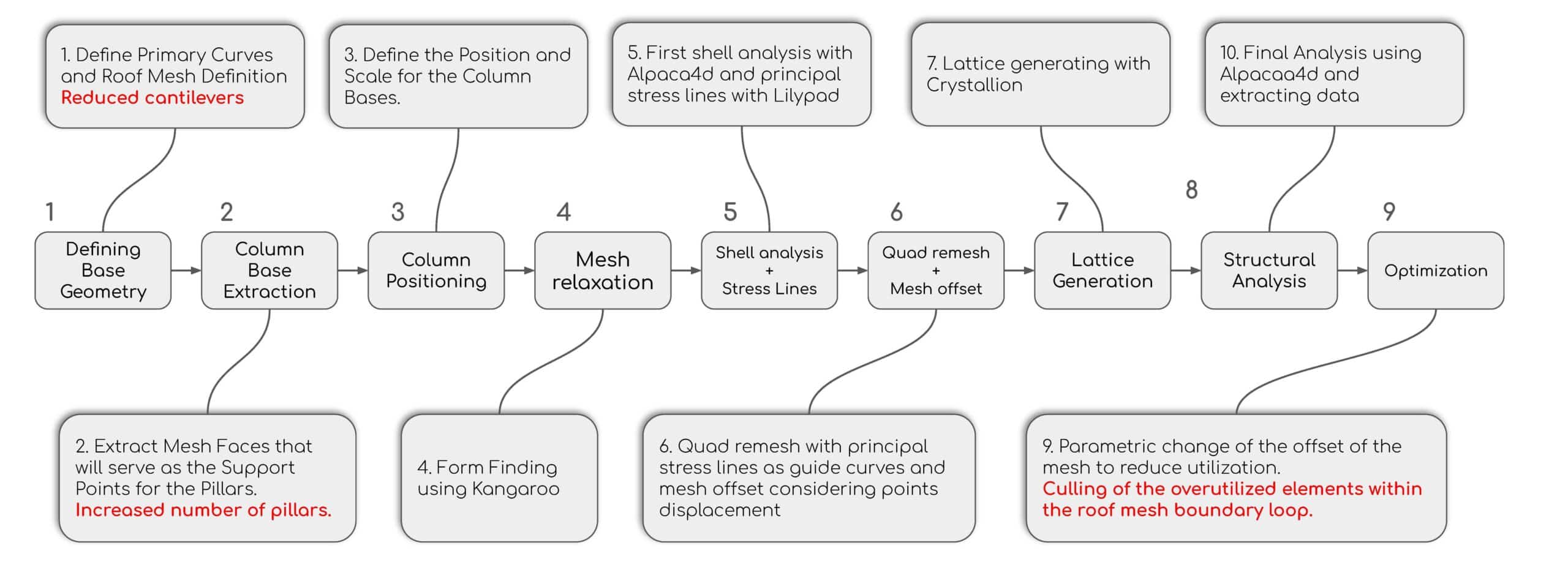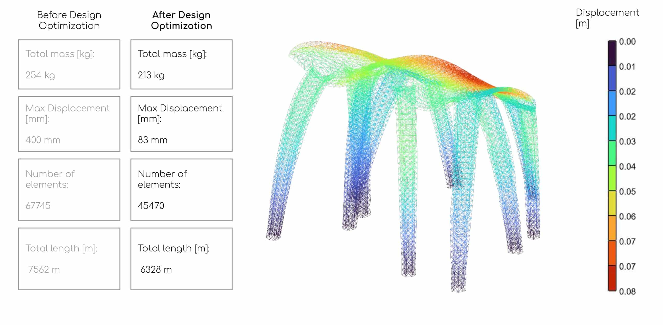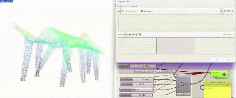 The impact on structural utilization was equally significant: the number of overutilized beams was drastically reduced, with only 6 elements exceeding capacity out of a total of approximately 45,500. While this iteration represents a substantial leap in performance, it is not yet the “perfect” solution; however, it demonstrates that through further refinement of the computational workflow, achieving the absolute structural optimum is well within reach.