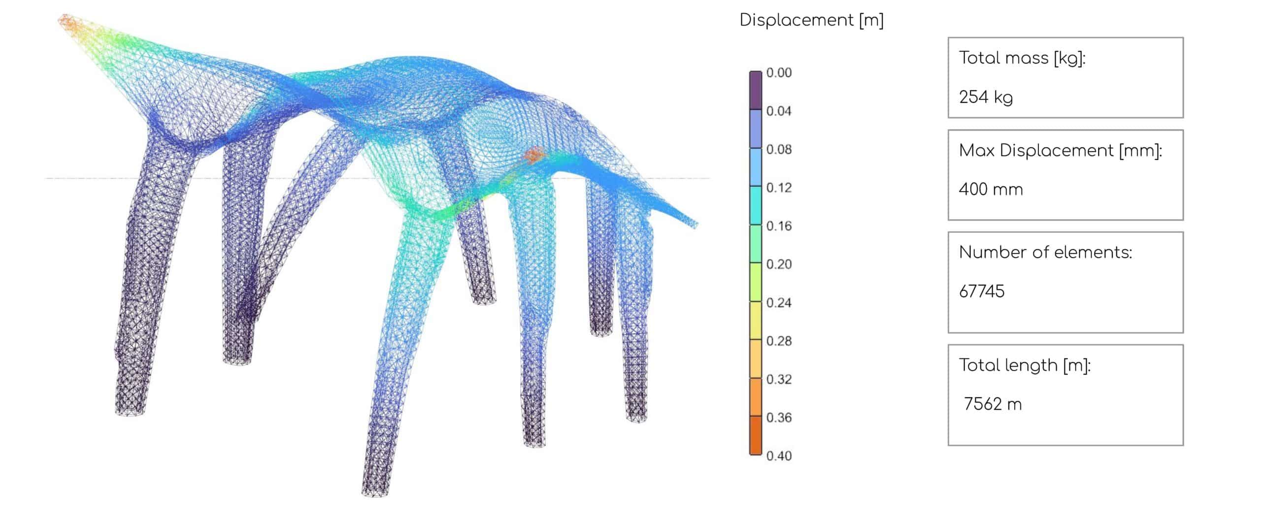 By taking a critical step back to reassess the global geometry, the initial form of the pavilion underwent significant structural modifications. The cantilevered portions of the roof were reduced in span, and additional structural pillars were integrated to provide a more direct load path to the ground. As a result, the global maximum displacement was considerably minimized.
