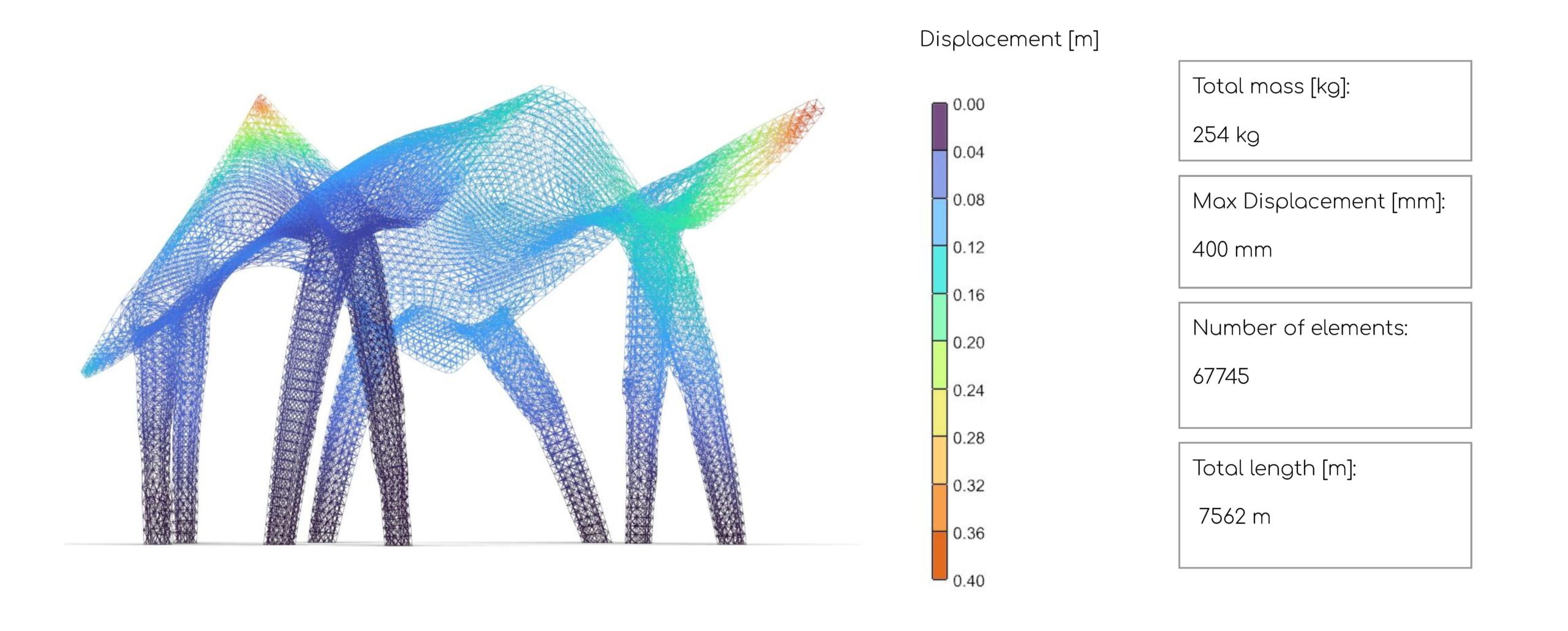 Furthermore, a strategic decision was made to remove the outer boundary loop from the roof mesh, effectively eliminating the perimeter elements subjected to the highest stress concentrations. This design refinement led to a further reduction in maximum displacement, reaching a final value of 83 mm.
