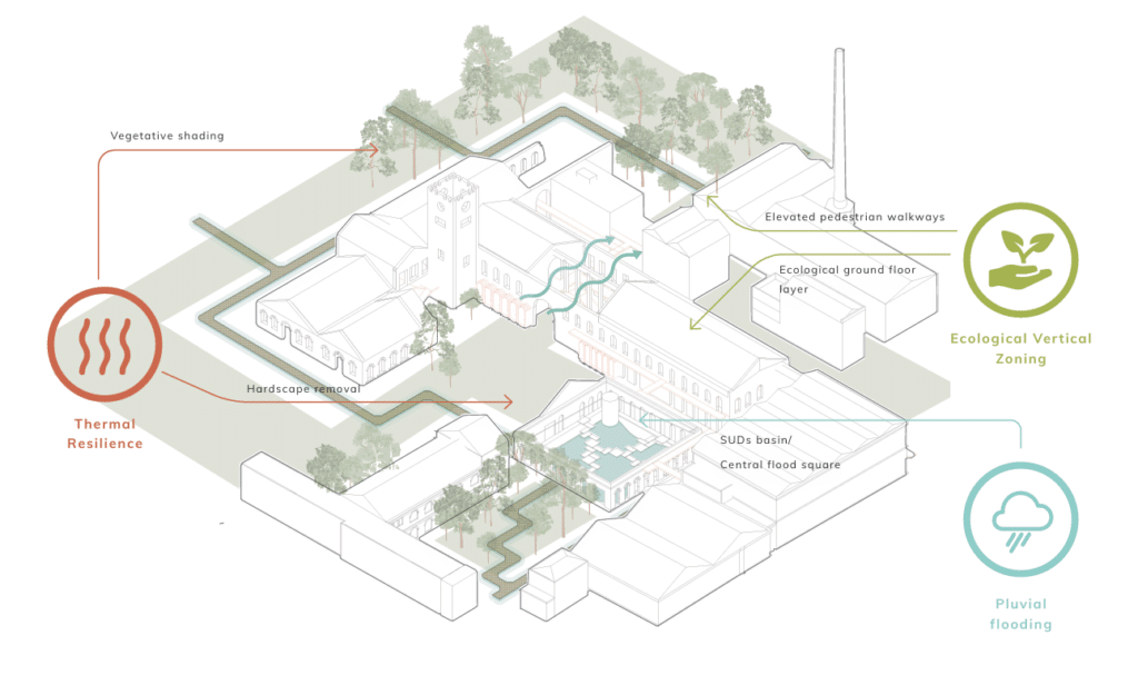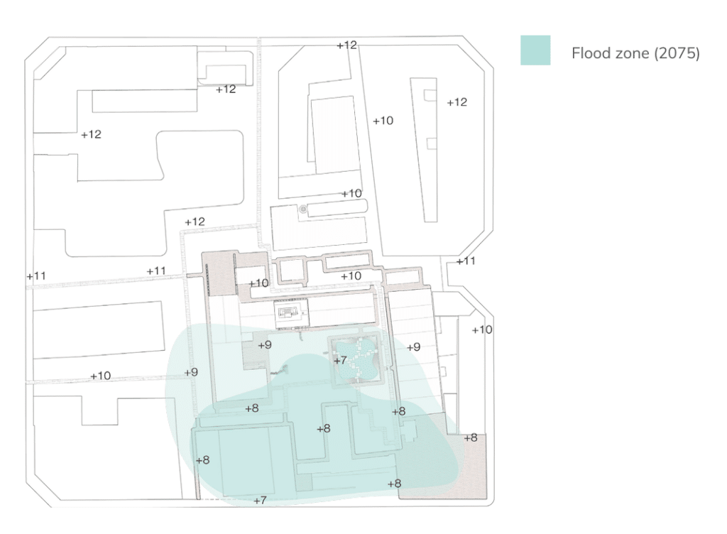 The location, elevation and material strategy at Can Ricart leave the central corridor of the site particularly vulnerable to catastrophic flooding.