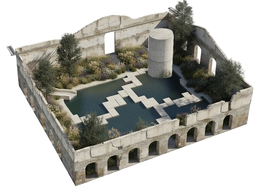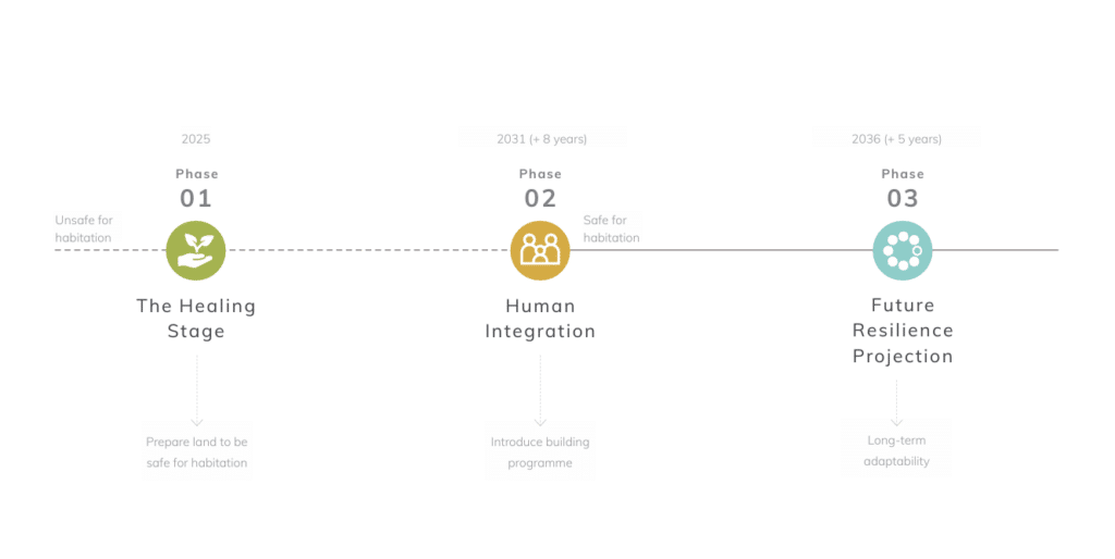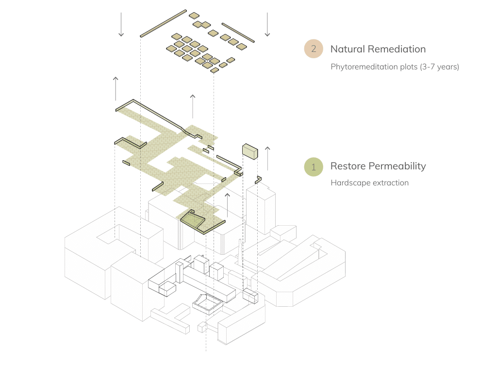 By the end of Phase 1, the site will be environmentally stabilized, safe for human reintroduction, and equipped with systems of long-term resilience. Flood risk is reduced, soil health is restored, and the transformation from hardscape to living landscape establishes a new ecological foundation for future phases.