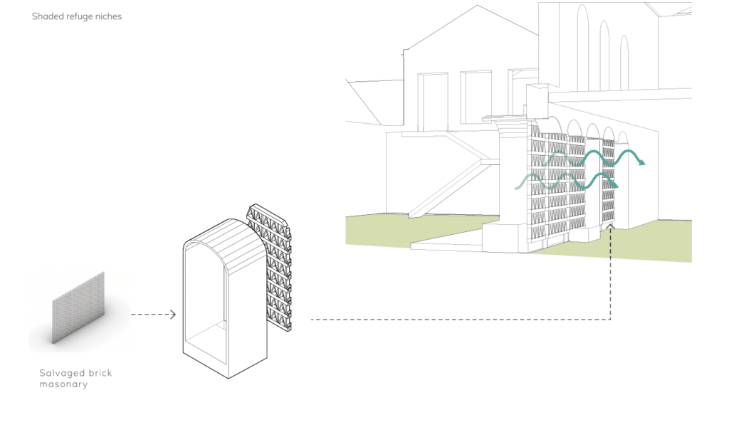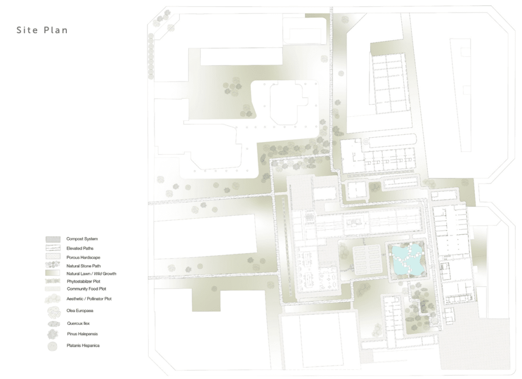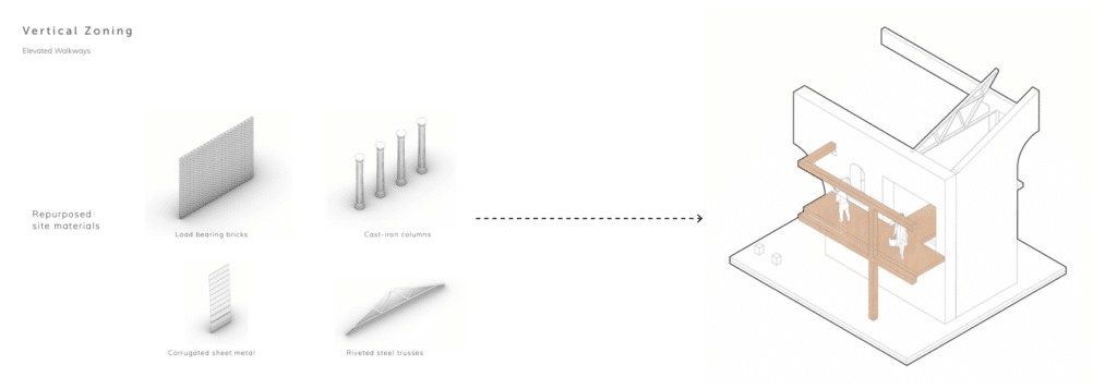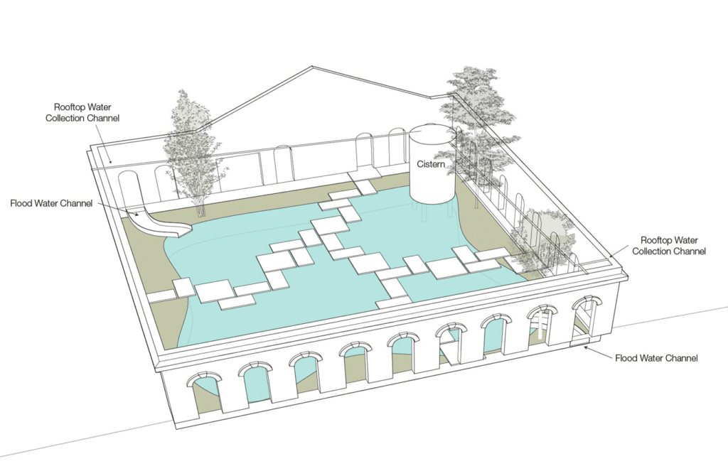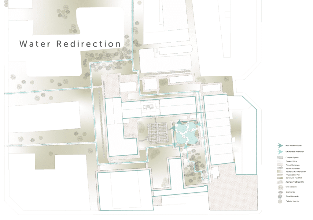 Redirected ground water from across the site will be fed into an interactive water feature built in the reclaimed ruins of a derelict building, restoring purpose while preserving industrial heritage. Rooftop rainwater collection will also be collected and fed into a cistern system within the water feature that will be used as an irrigation source for the adjacent community garden.