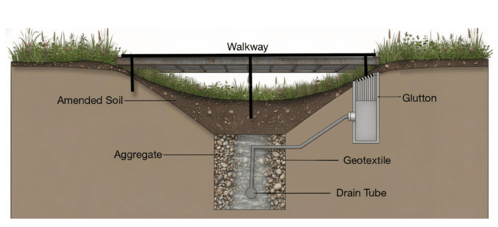 A network of gently sloping ditches will be carved across the site redirecting ground water into an interactive water feature both preventing catastrophic flooding and creating a nature immersion experience for pedestrians. An elevated walkway will be constructed above the ditch system serving the dual purposes of providing human paths accessing all points of the site regardless of current water levels and allowing native non- human species to