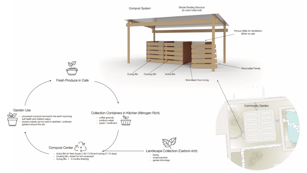 One final example of circularity is the relationship between the café and the community garden. Organic waste from the café, combined with landscape waste, is composted on site and returned to the soil—supporting food production that feeds directly back into the café and reinforcing a closed-loop system of use and reuse.