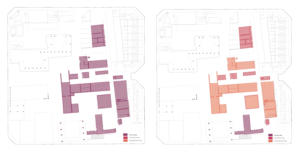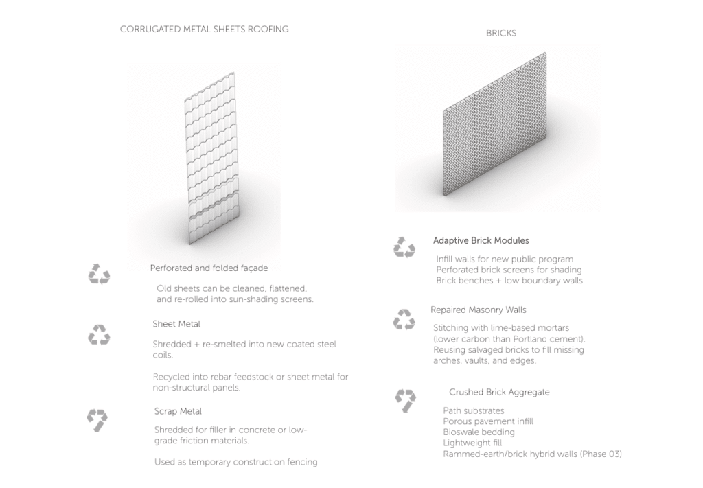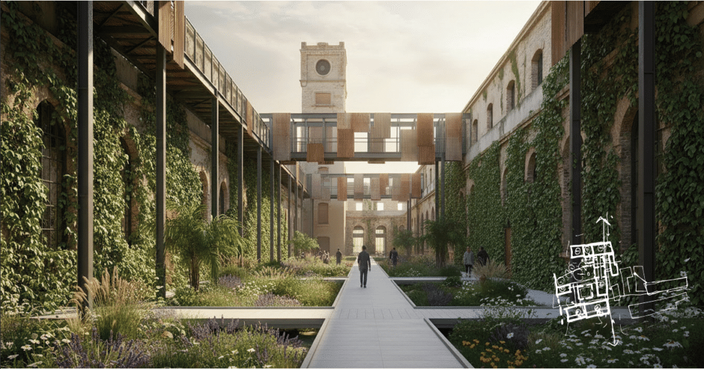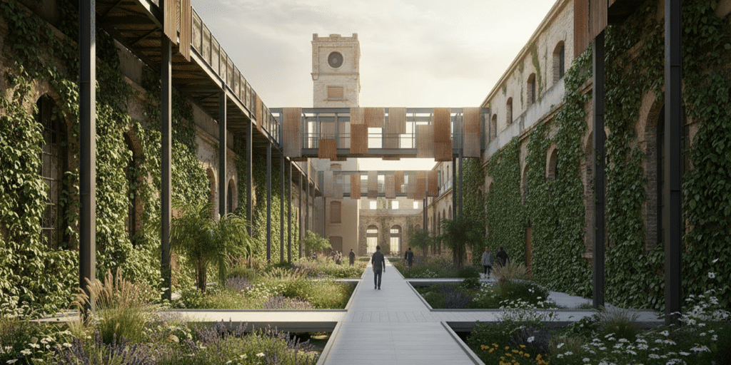 Through selective extraction, structural retention, and material reuse, the Can Ricart regeneration achieves an estimated 35% reduction in embodied carbon compared to a demolition-and-rebuild scenario, despite the addition of new public infrastructure and ecological systems.