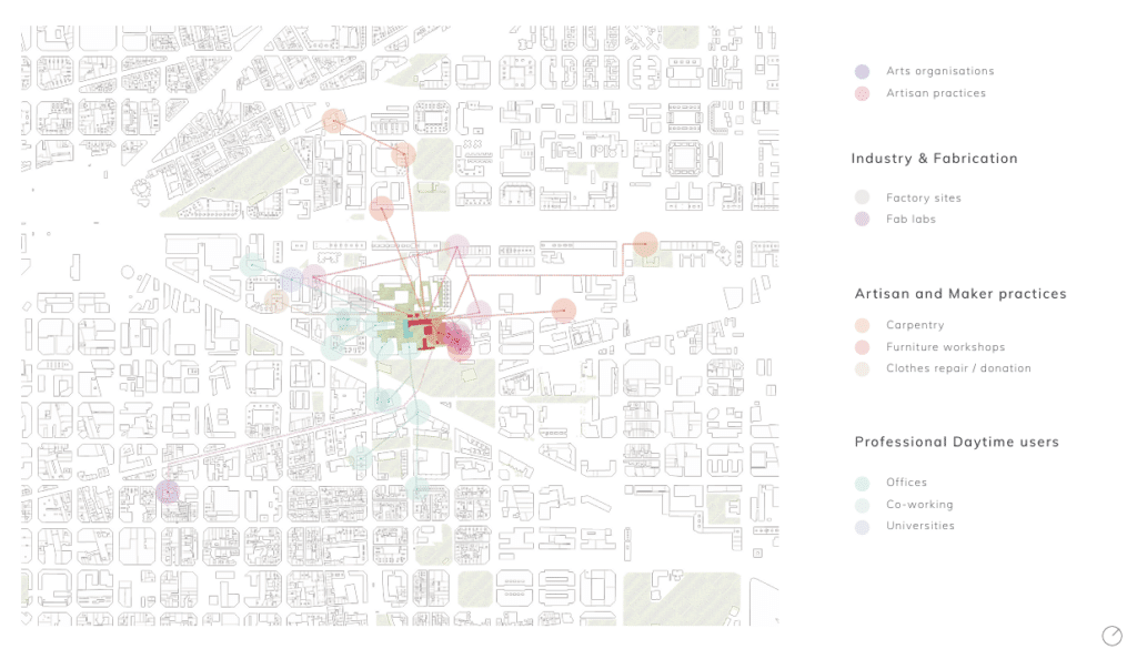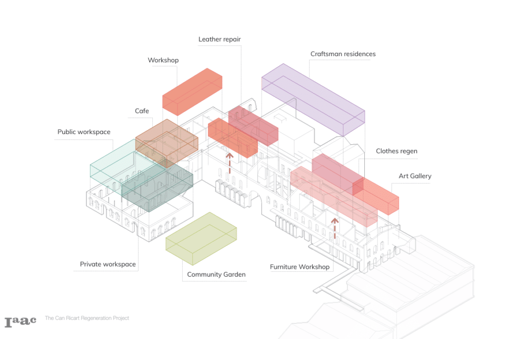 The program that will be introduced during phase 2 takes into consideration the network of artisan programming surrounding our site and finds opportunities to compliment and interweave into the surrounding context while addressing the needs and desires of residents and community members of Can Ricart. Additionally, key infrastructure is moved above ground level with ground floor programming being permeable and floodable in the event of future flood activity.