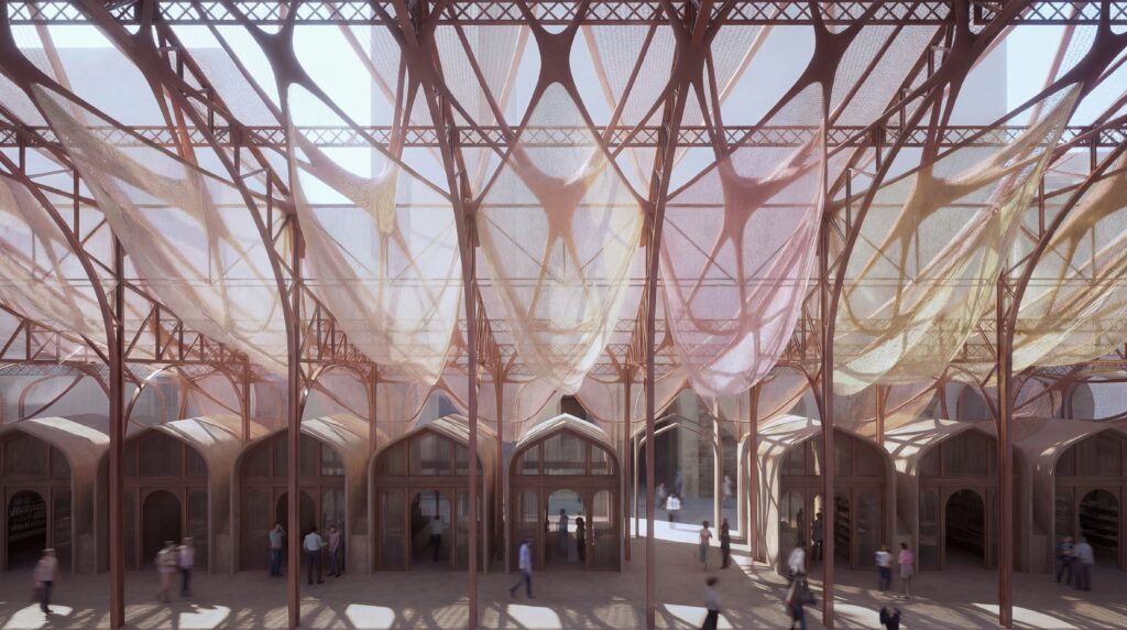 Although the market’s original design was inspired by Les Halles in Paris, this project aims to reconnect the architecture to its local context. The traditional arches of the gates became a guiding motif, extended across the new roof and throughout the design, sometimes intertwining to create dynamic patterns.
