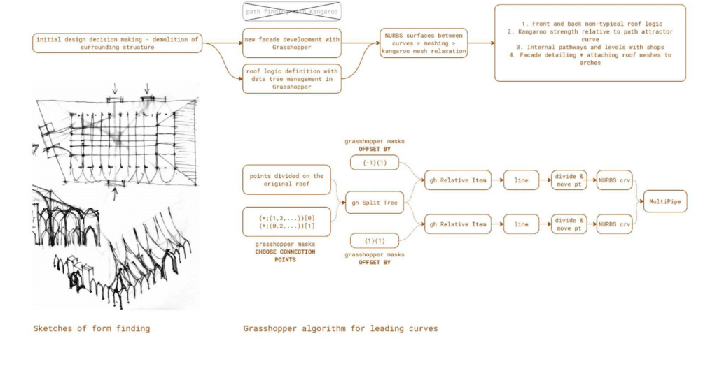 From a computational perspective, Grasshopper masks were used to manage complex curve connections efficiently. While the logic became complex, this method allowed fast iteration and control over the intricate geometry.