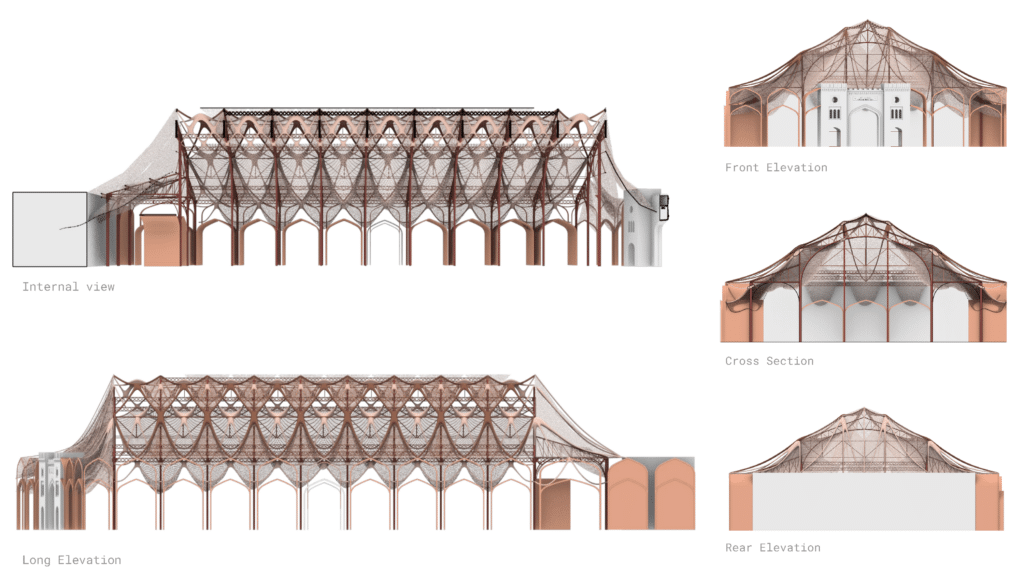 The arches intertwine and extend upward, connecting to the top of the existing steel frame, generating a new roof typology.