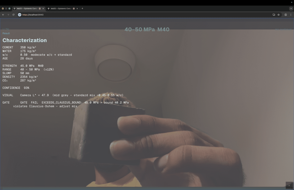 MaOS demonstrates that the future of construction isn’t just “smarter” machines, but sovereign material audits. By placing a thermodynamic gate inside the architect’s pocket, we move the threshold of material admissibility from the lab to the site, enabling the safe use of highly variable, circular feedstocks (RAC, Earth, Bio-based).