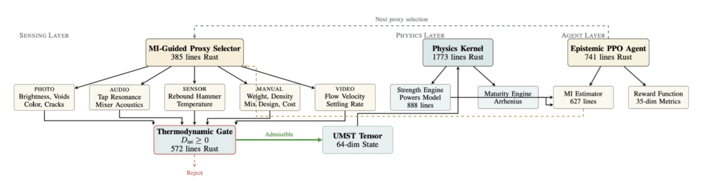 While the AI guides the sensing, a Hard Physics Gate ensures that no physically impossible material state enters the world model. Every sensor reading is validated against the Clausius-Duhem Inequality, enforcing thermodynamic admissibility in real-time.