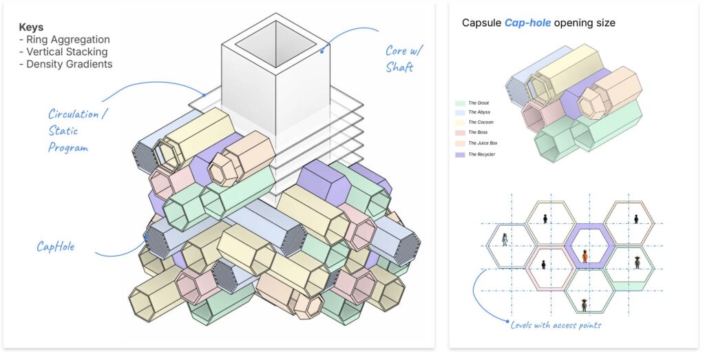 Finally, we use data to be “Good Neighbors.” Through shadow optimization and daylight analysis, we pixelate and reposition capsules to ensure that our vertical community doesn’t steal the sun from the context below. We are using algorithms to negotiate the relationship between a massive structure and the human-scale city.