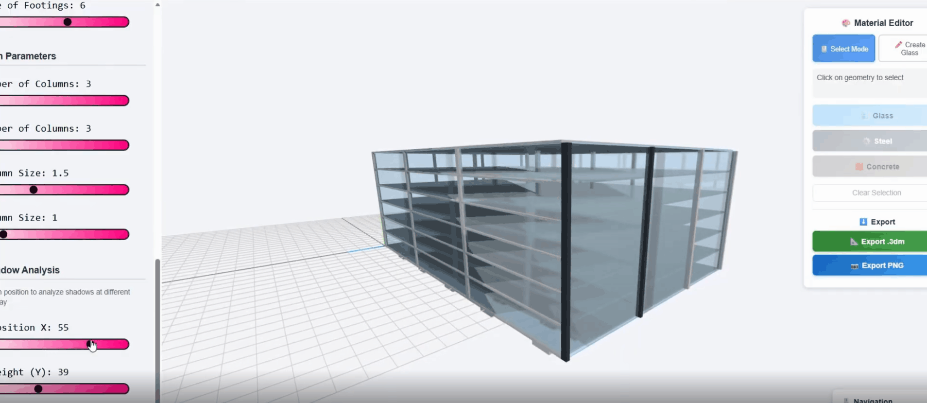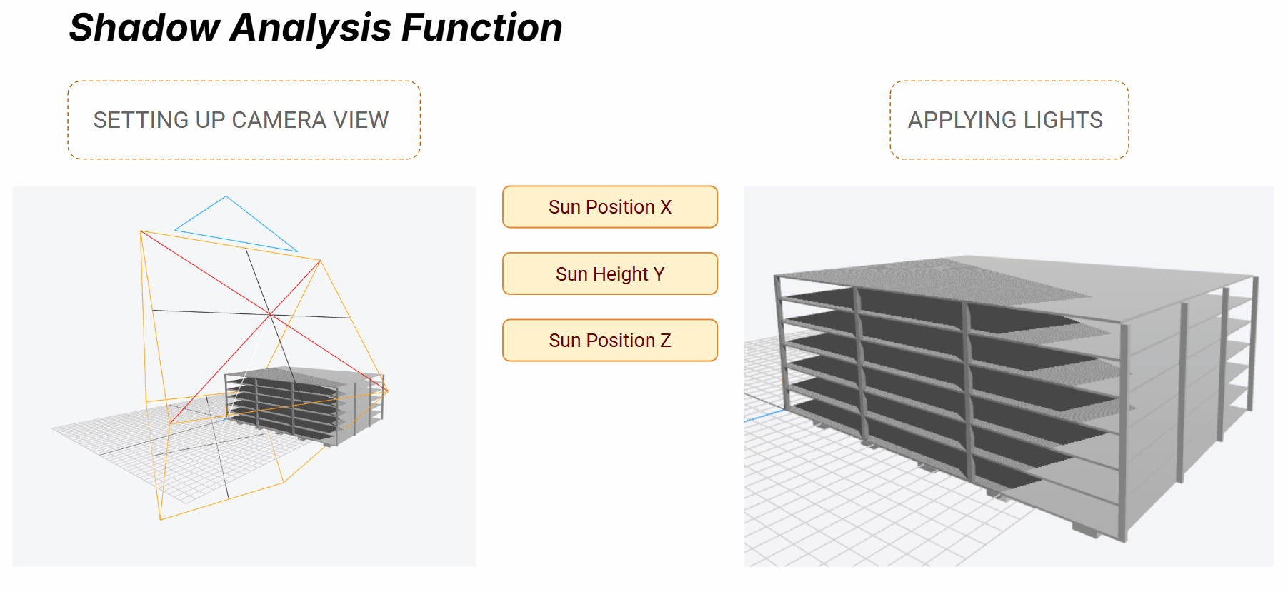 To ground the model in a realistic environment, I integrated a Shadow Analysis function. By sampling and modifying lighting and camera logic from the Three.js documentation, I established a dynamic sun positioning system. I can adjust the Sun’s X, Y, and Z coordinates to observe how shadows interact with the structural grid, ensuring the environment responds accurately to every change in the camera view.