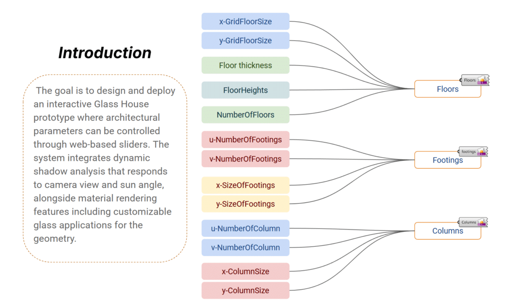 I developed this project to design and deploy an interactive Glass House prototype where architectural parameters are controlled through web-based sliders. As you can see from my workflow, I’ve built a system that integrates structural data—like floor thickness, footing sizes, and column counts—directly into the browser. This allows for instant geometric manipulation, bridging the gap between raw data and architectural form