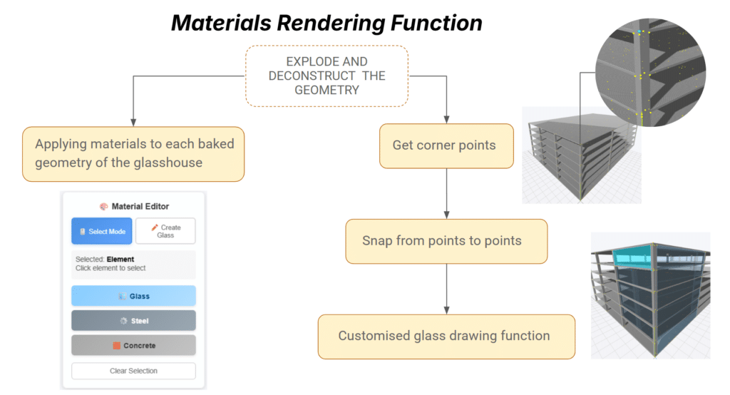 For the Materials Rendering, I created a process to explode and deconstruct the geometry down to its corner points. This allows my customized glass drawing function to ‘snap’ panels into place with precision. Using a Material Editor adapted from Three.js samples, I can toggle between glass, steel, and concrete, making the final prototype not just a static model, but a fully interactive design tool.