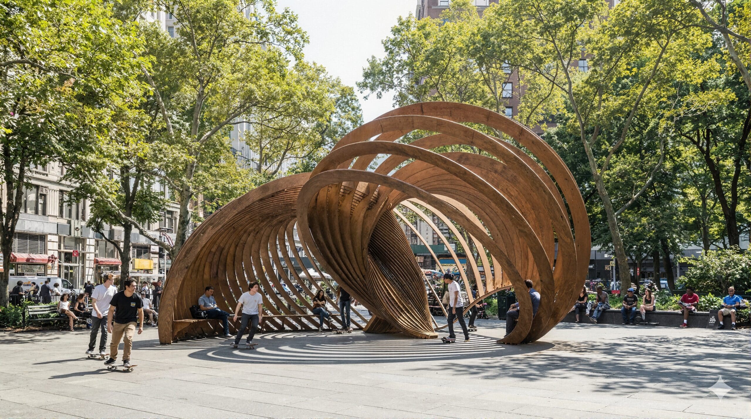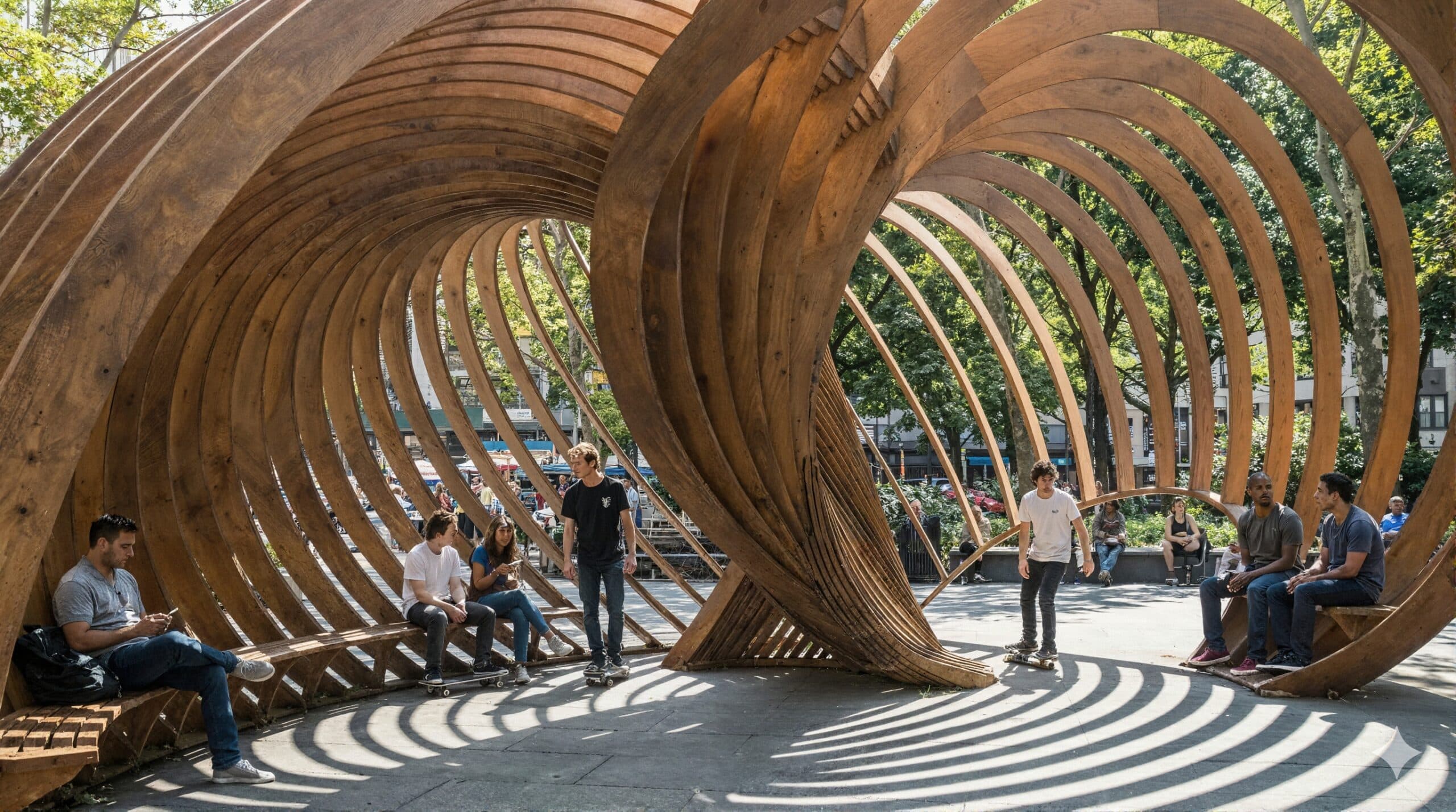 Using generative design tools, the structure evolved from analyzing pedestrian flows and skater trajectories. The resulting timber lattice acts as a “kinetic node,” offering shade for the public and complex, non-standard terrain for skaters.