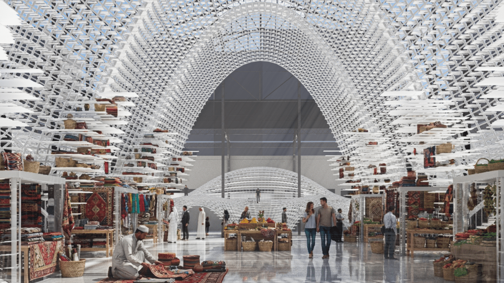 The “sedimented light” effect created by the lattice, filtering sunlight into the market below .
