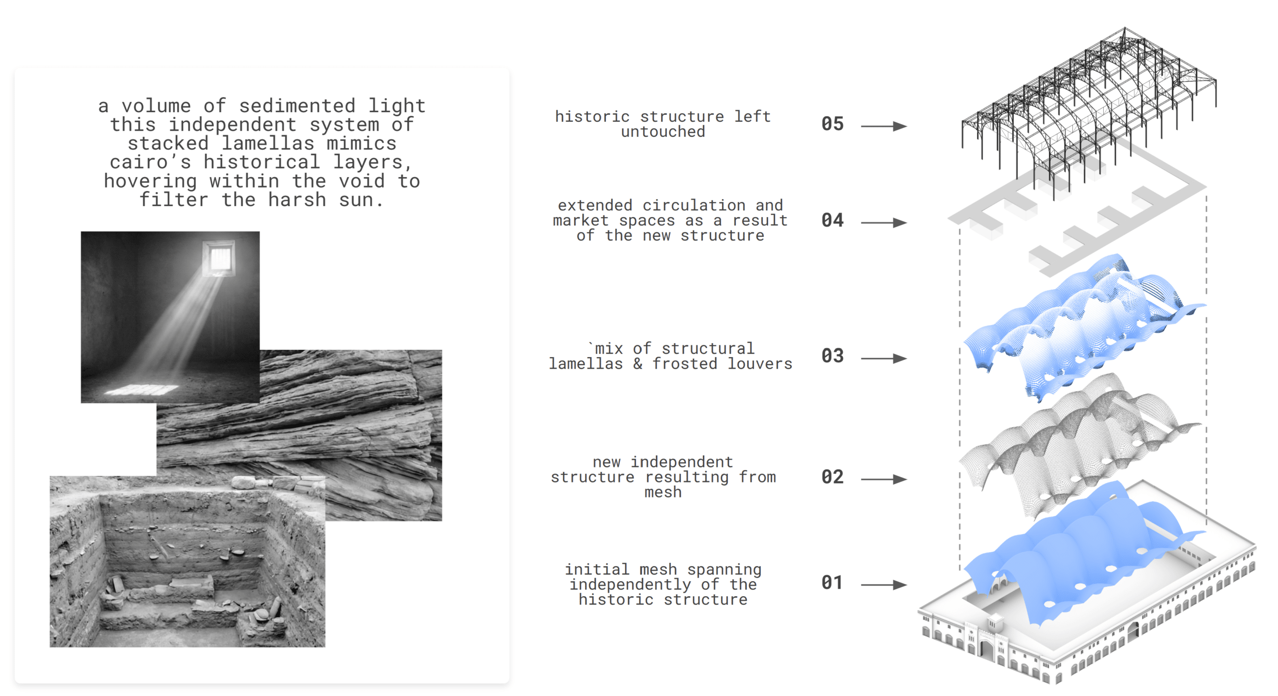 In the dense historic fabric of Cairo, light is both a blessing and a burden. The Luminous Stratum proposes a new architectural language that negotiates this relationship – a “volume of sedimented light” that mimics the city’s historical stratification while filtering the harsh sun .