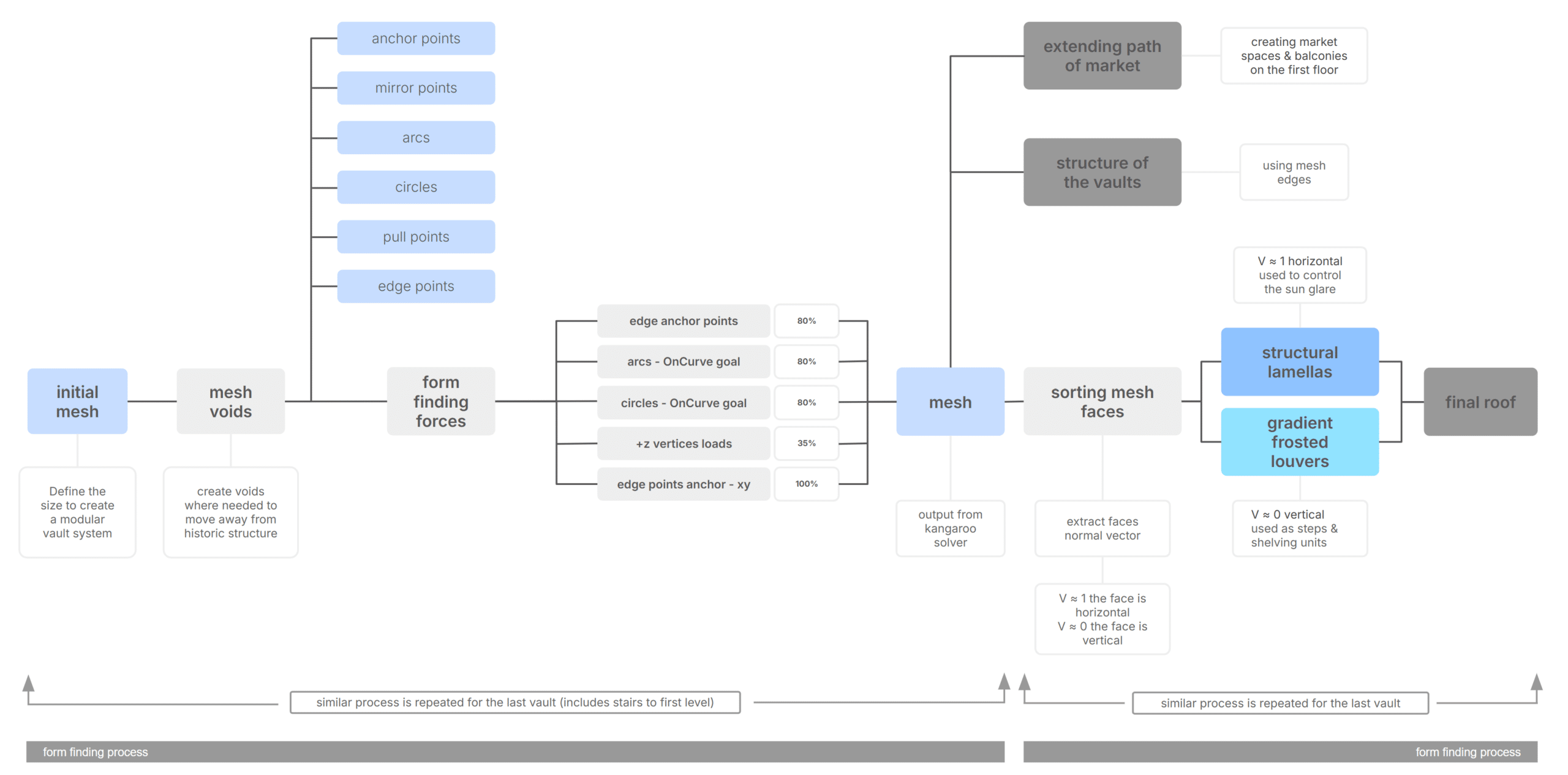 The computational logic defining anchor points, form-finding forces, and the sorting of mesh faces .