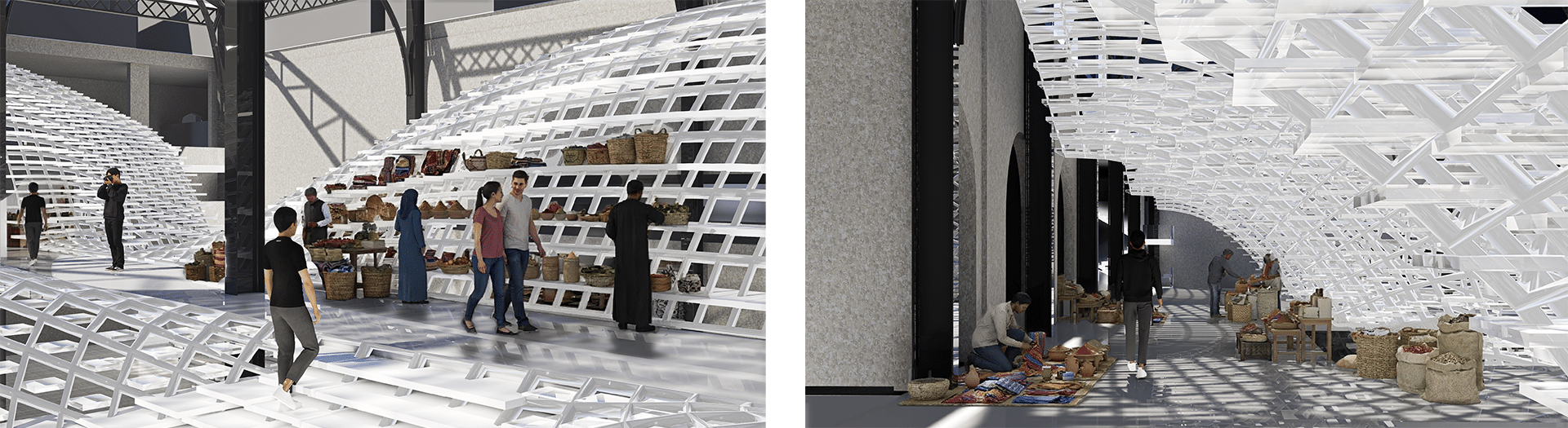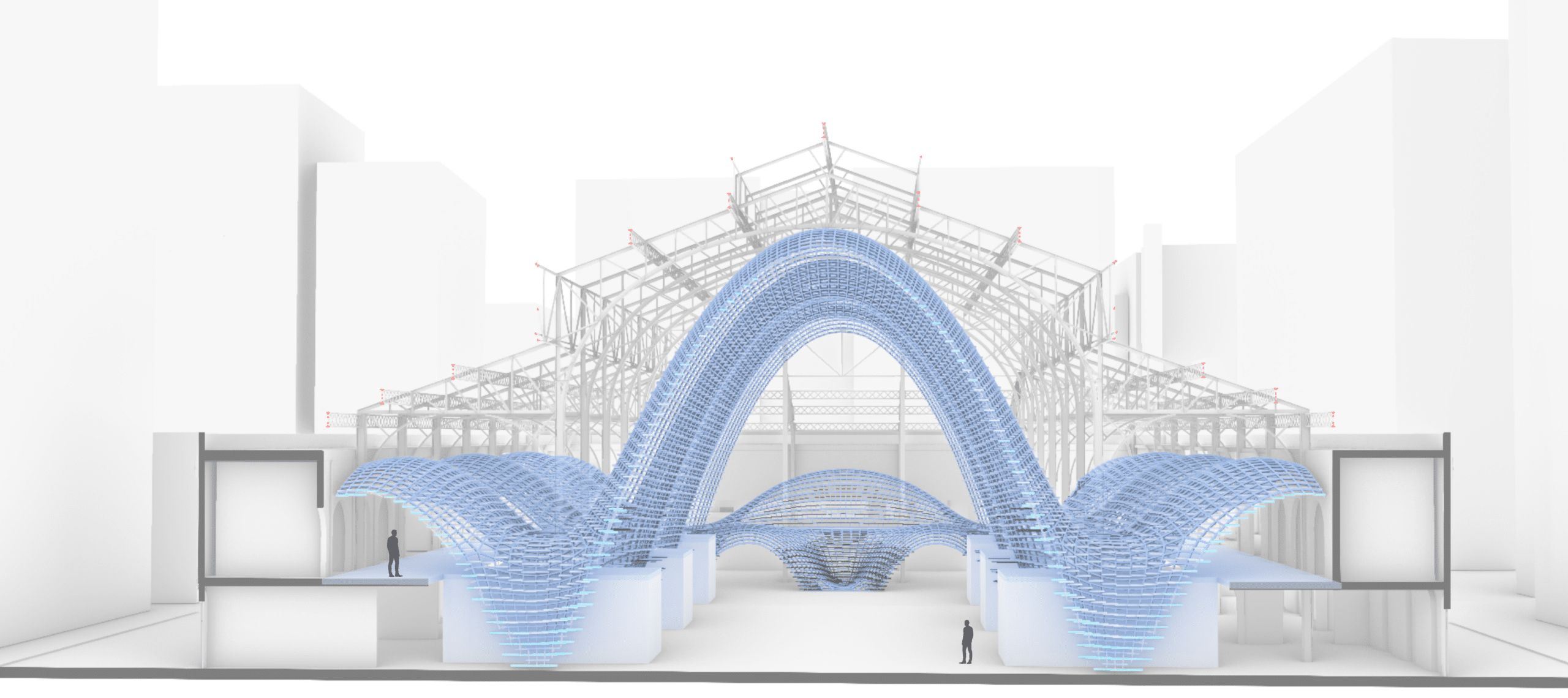 The Luminous Stratum reads as a continuous volume, an independent lattice that nests within the historic void . By turning a pattern into a structural filter, the project revitalizes the market below, creating an atmosphere of filtered light that respects the past while embracing a computational future.