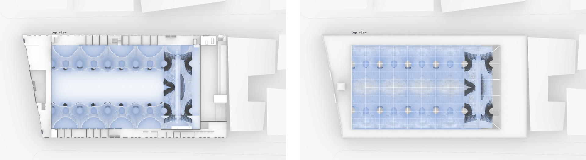 The resulting architecture is a modular system, repeated to cover the length of the market hall. However, the system remains adaptable. For the last vault in the sequence, the workflow was modified with different anchor points to generate a continuous staircase, seamlessly connecting the ground floor to the upper level.