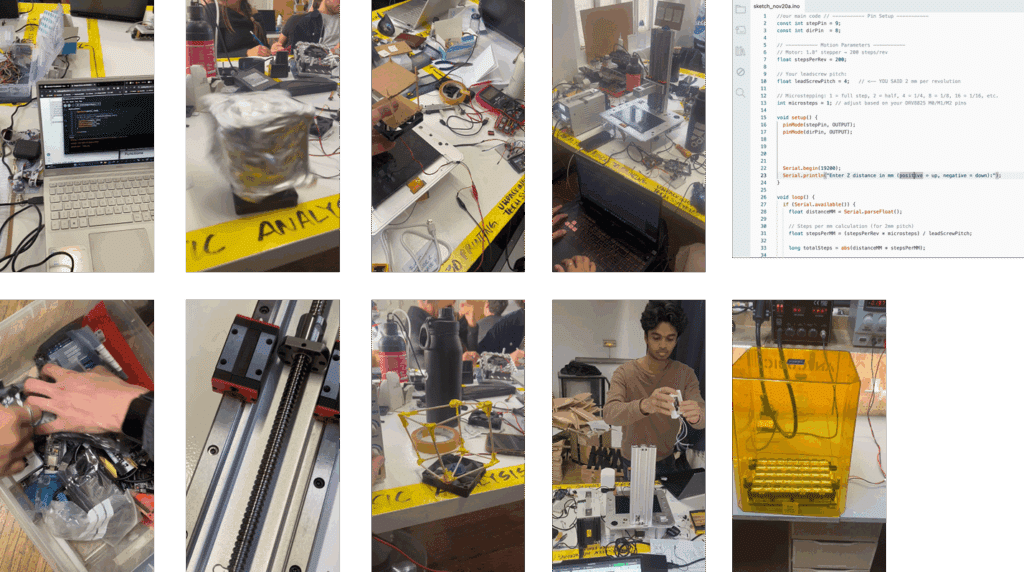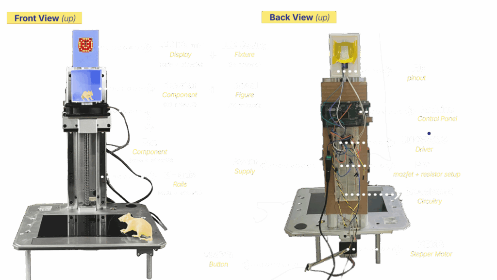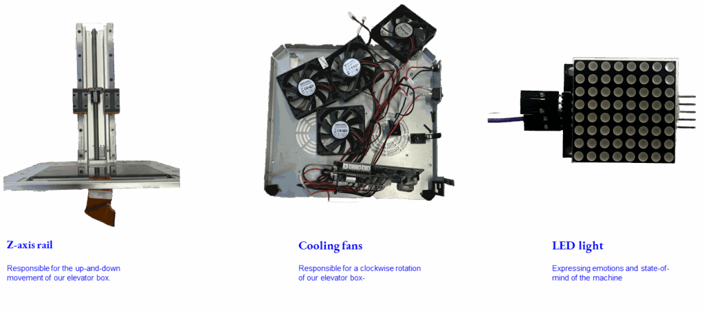 The component contains mechanical and electronic elements. The Z lead screw, platform bucket and the dual rail are the mechanical elements operated by the electro motor. The motor receives power and instructions via signal from the motherboard. The motor rotates the Z leads screw through steps triggered by signals. Later in this document we describe in detail the code snippet we used to activate the motor and movement.