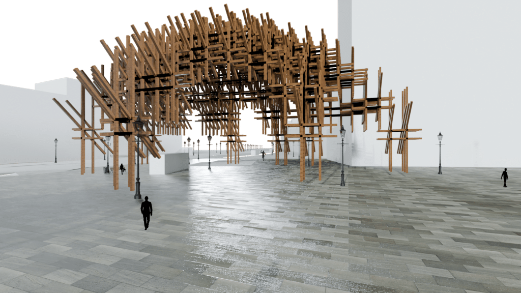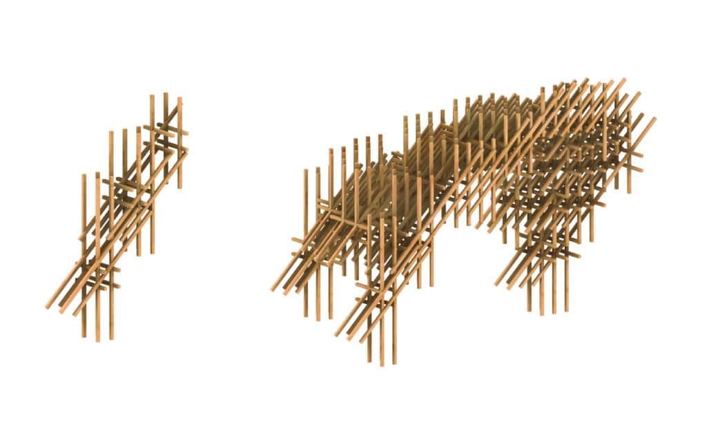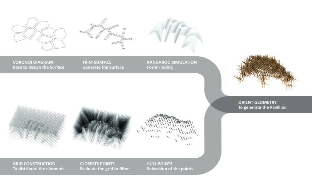 The process of searching for shapes begins with a series of points distributed on the ground, from which a Voronoi triangulation is drawn to obtain a tree-like figure necessary for textile simulations such as those of Kangaroo. At the same time, a regular grid of points was constructed to filter those closest to this surface, and with this filter, the discrete wooden elements were distributed to generate this self-supporting structure from the simulation.