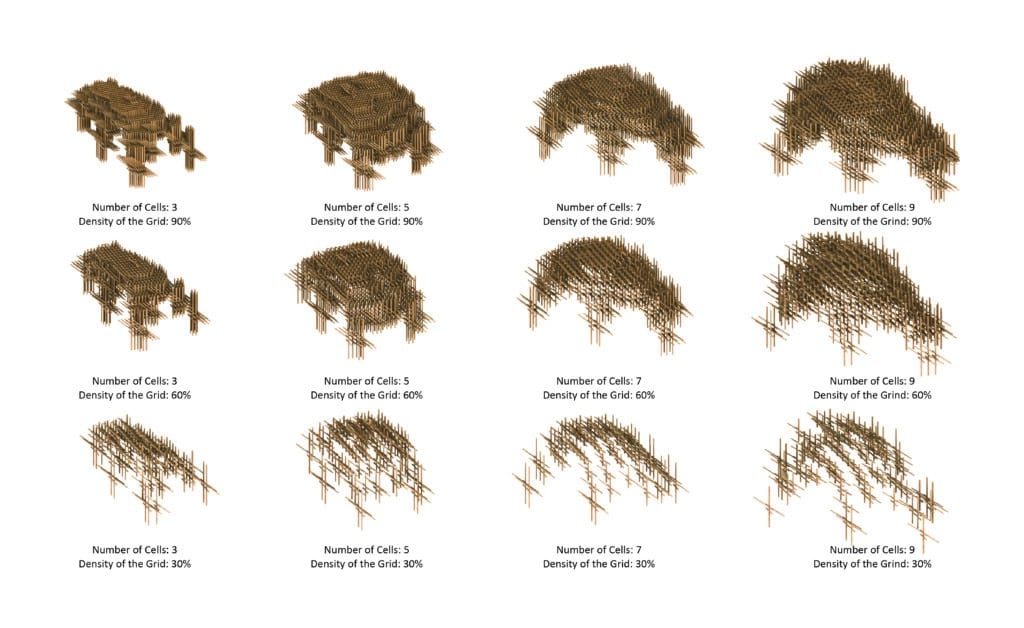 The algorithm allows control over the number of modules considered for the simulation, and therefore the final size of the pavilion. This grid of variations shows a series of explorations that were carried out to find the best relationship between the size of the pavilion and the density of the grid where the discrete elements are distributed.