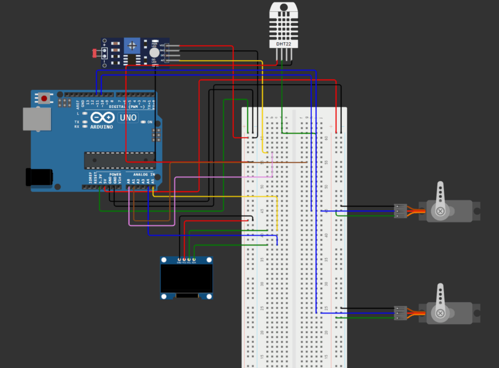 If the temperature inside the pavilion is high or the noise level outside is high, both panels will close automatically using the servo motors. Below is how this logic connects to your architecture layers and the circuit design: