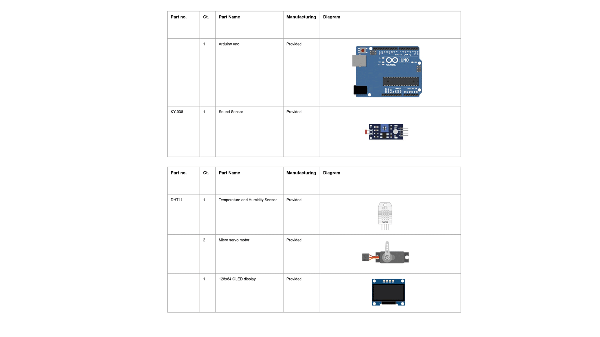 The interconnected hardware modules that compose the pavilion’s responsive system. Sensors like the KY-038 sound sensor and DHT11 temperature/humidity sensor form the sensing layer, gathering real-time environmental data. This information is processed by the Arduino UNO, which interprets and fuses the inputs in the processing layer. Based on processed signals, the actuation layer—micro servo motors and the OLED display—triggers mechanical movement or visual feedback, visibly responding to changes in noise or temperature. Finally, the data layer logs, stores, and visualizes all collected information, ensuring that the pavilion’s reactions are easy to monitor and understand. Together, these layers create a dynamic feedback loop, making the invisible forces of the environment both tangible and interactive.