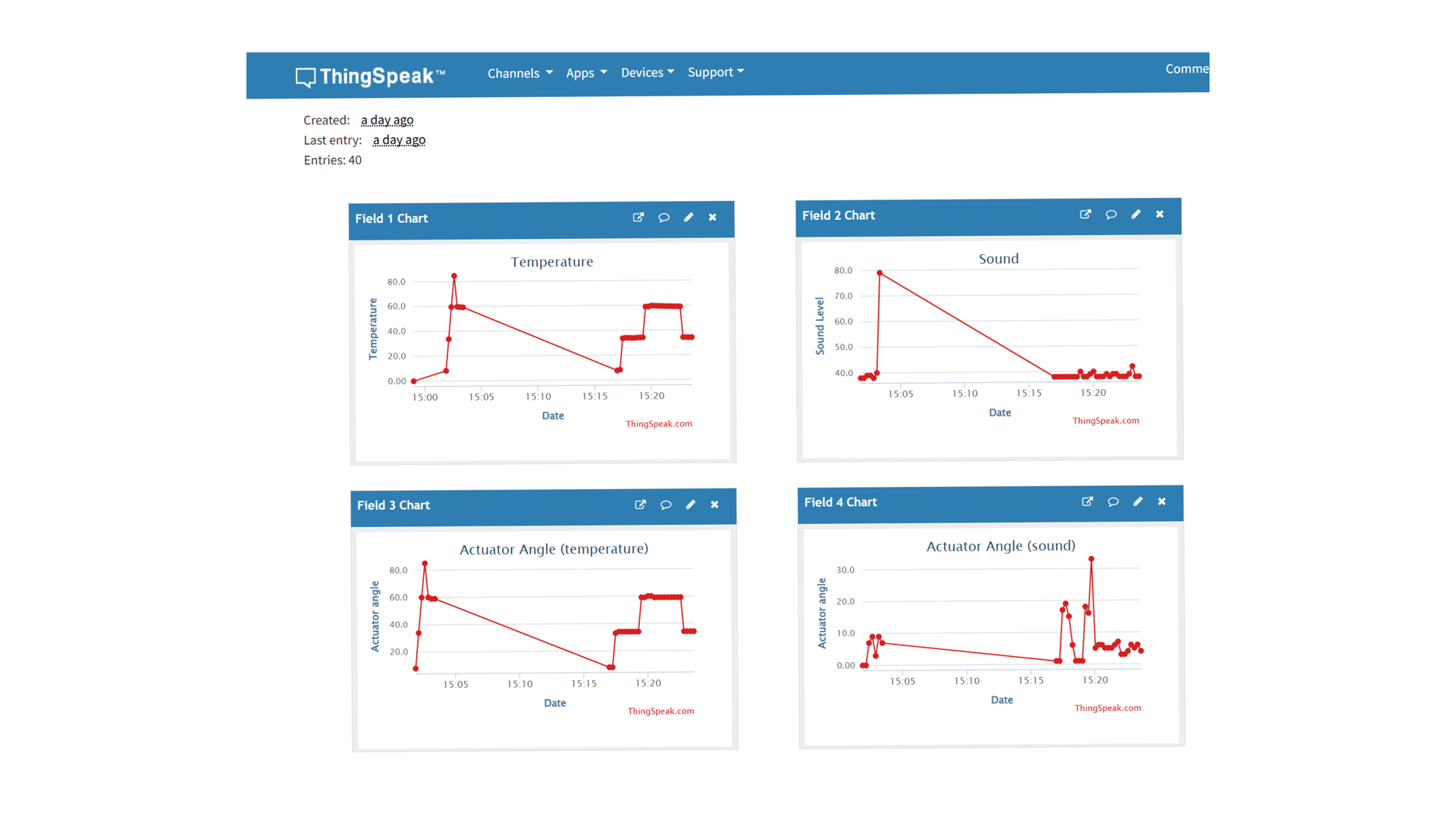 Real-time data visualizations from ThingSpeak for an environmental sensing and actuation system in a pavilion. The system monitors temperature and sound levels, and then triggers servo actuators to control pavilion panels.