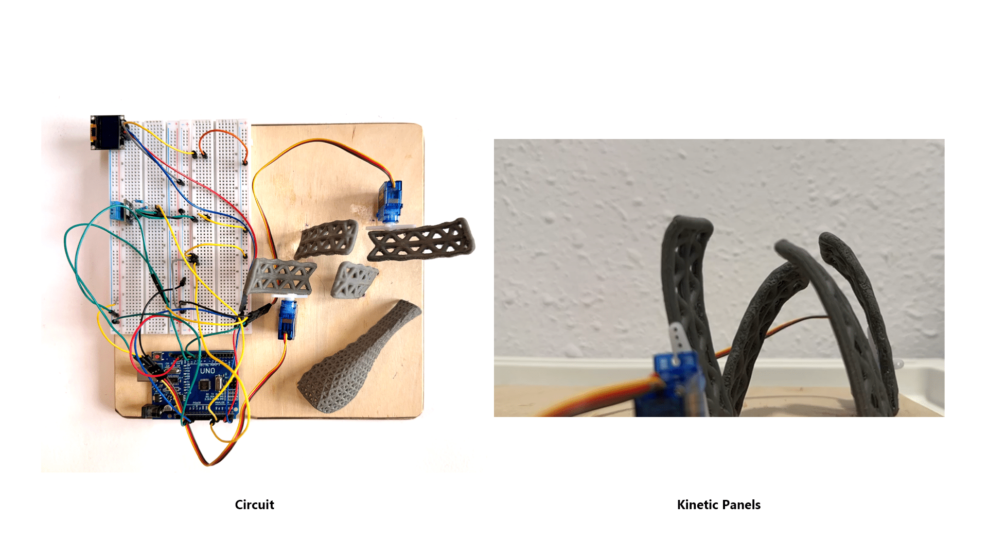 The functional prototype of the responsive pavilion system. On the left, the Arduino-based electronic circuit integrates sound and temperature sensors to monitor environmental changes in real time. On the right, 3D-printed kinetic panels are driven by servo motors, dynamically opening and closing in response to the sensory input. This tangible workflow—sensing, processing, actuation, and visual feedback—demonstrates how the pavilion’s structure adapts, visually communicating the invisible fluctuations of noise and temperature within its environment.
