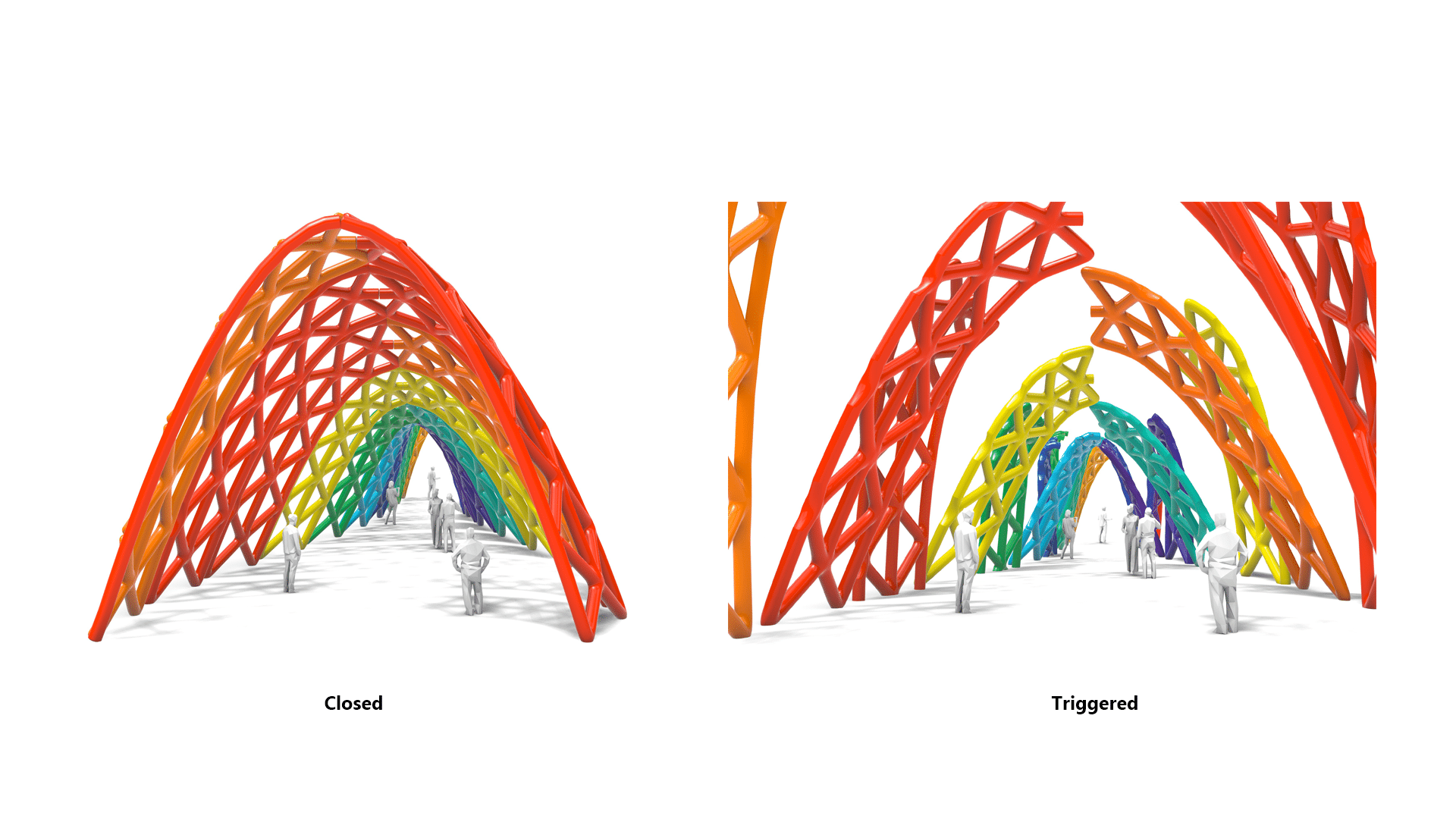 The pavilion’s vibrant arches respond to environmental triggers, shifting shape to make sound and temperature visible. This dynamic motion creates a lively, adaptive space in the urban plaza.