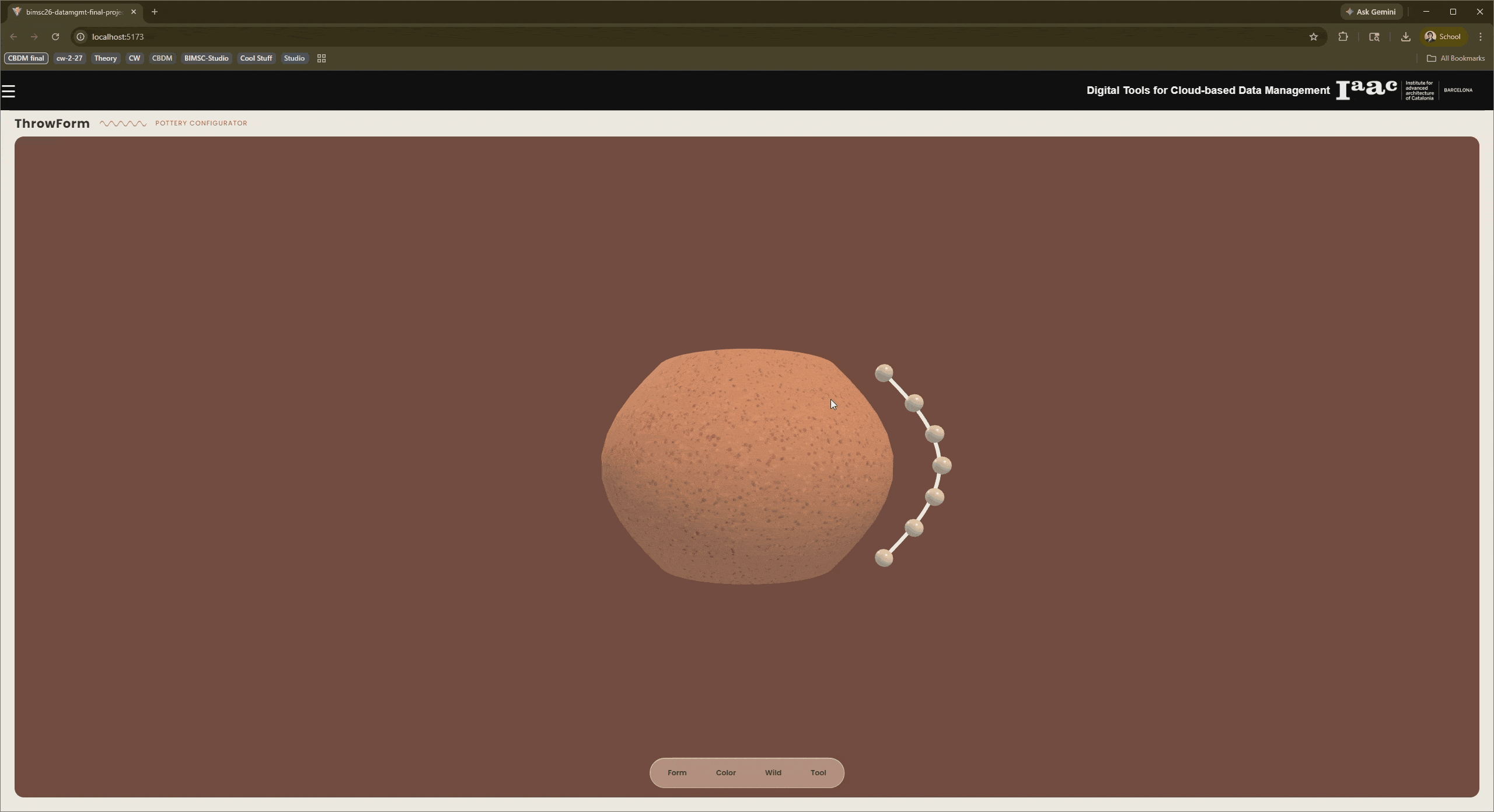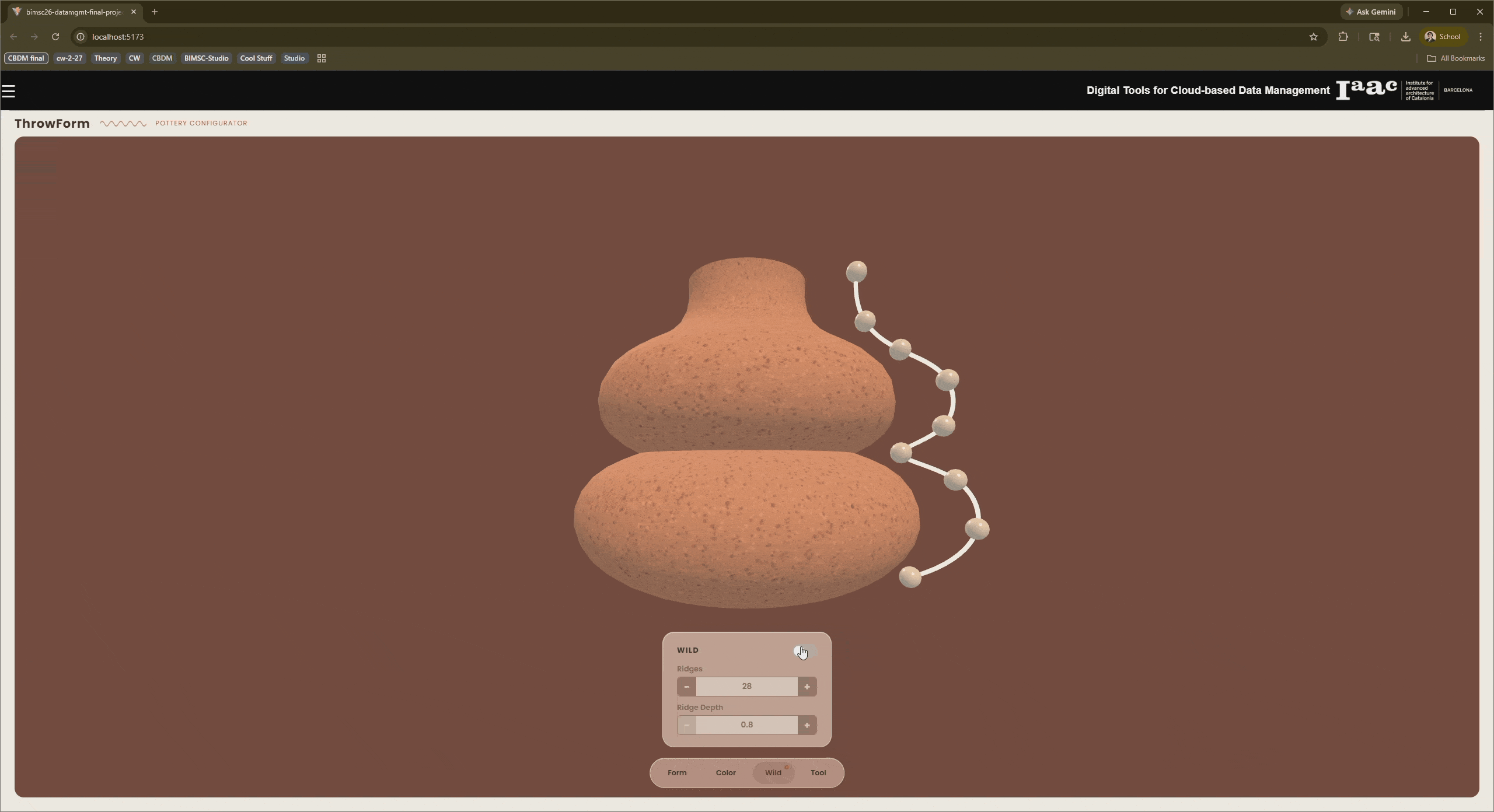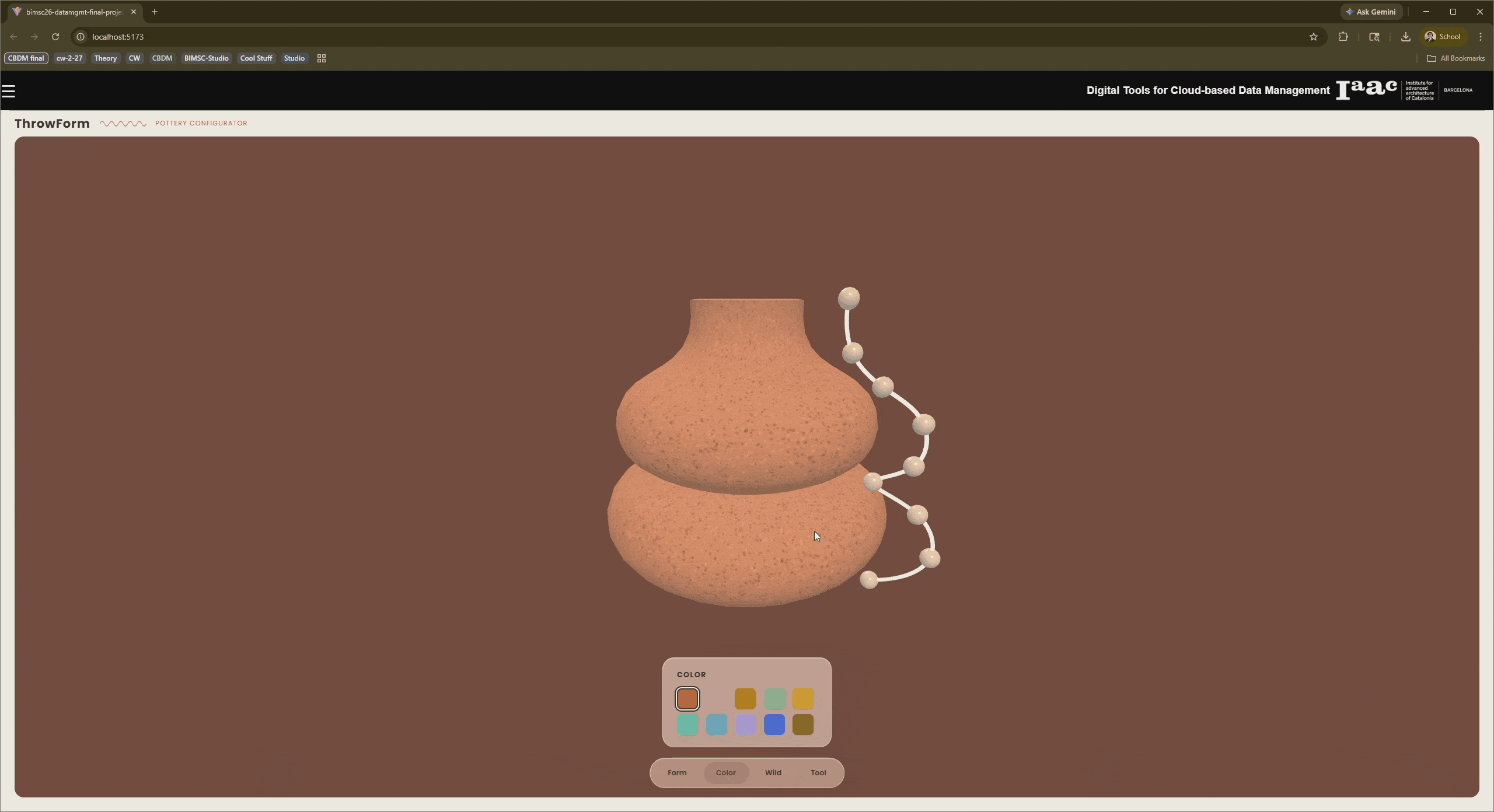 Pottery is one of humanity’s oldest crafts, shaped by hand and refined through repetition. ThrowForm is a web-based tool that lets you sculpt a virtual vessel with draggable control points, apply ceramic-inspired colors, add ridge textures, and export both the pot and a custom rib tool as 3D-printable files. It runs on Grasshopper, Rhino Compute, and Three.js, all in the browser.