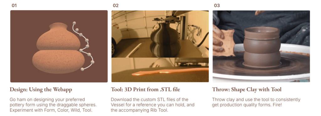 The workflow is simple. You land on the app and see your vessel in a 3D viewport. Drag the control point spheres directly on the model to sculpt the profile. Adjust sliders for height and thickness. Download and 3D Print the Tool. Then use the tool to slowly shape clay on the clay wheel for easy repetition and production quality results.