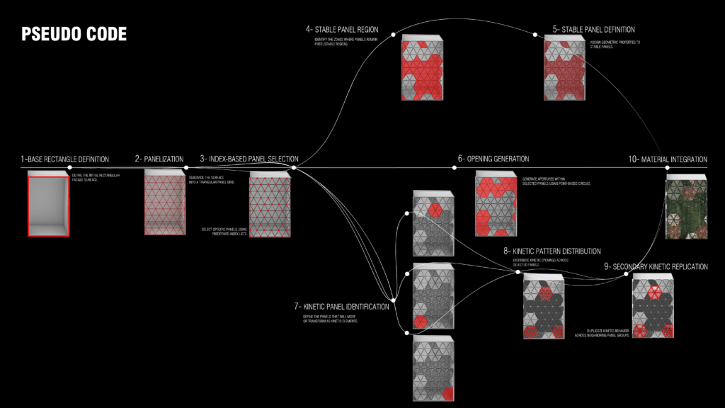 The parametric model defines a modular kinetic unit, driven by user inputs and geometric logic, simulating real-time transformation across the façade. This approach enables advanced control over actuation, panel behavior, and spatial depth supporting both aesthetic performance and environmental responsiveness in contemporary façade design.
