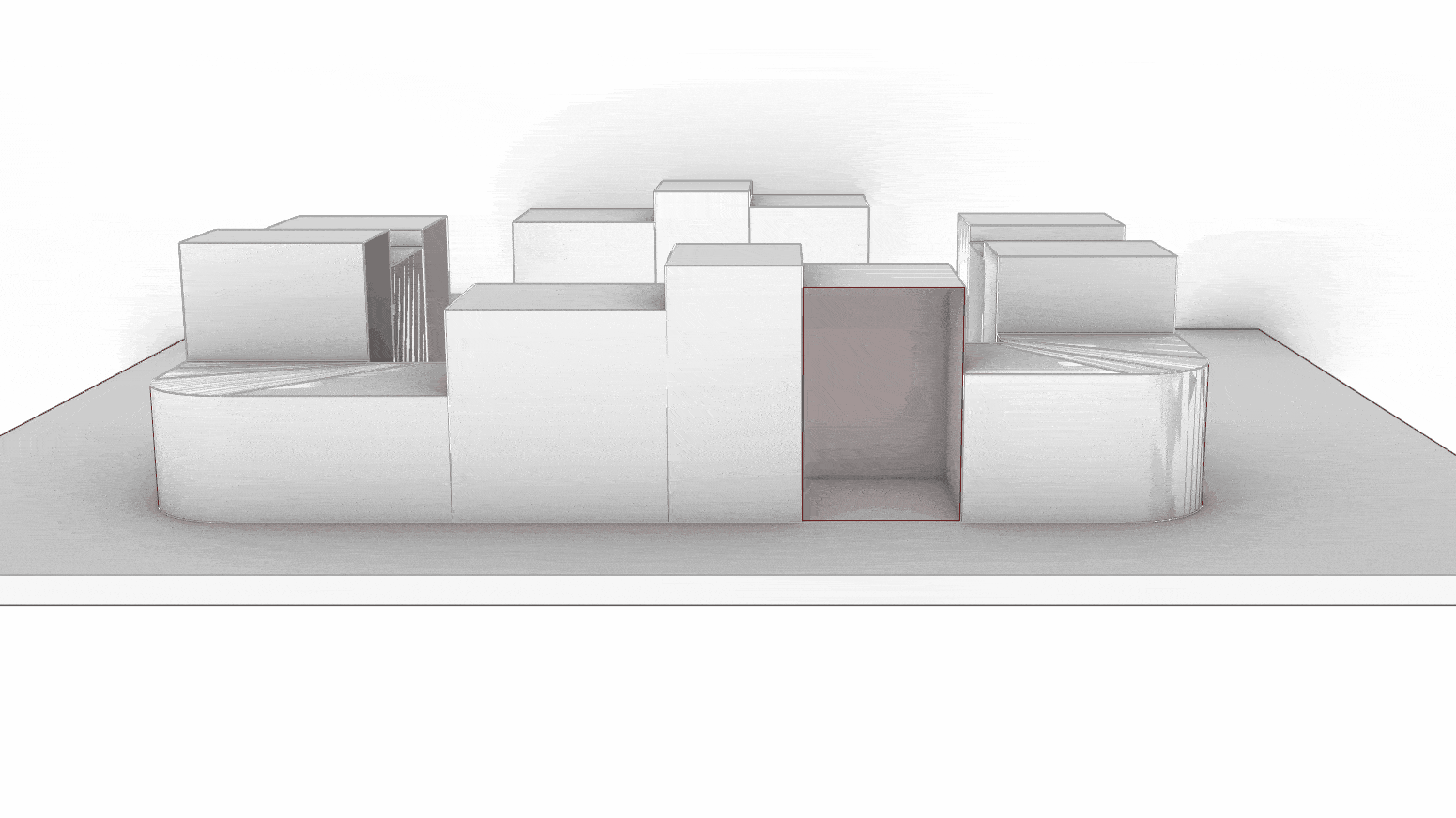 The process begins with simple rectilinear volumes arranged in a modular layout. Gradually, corner conditions are softened through curvature operations, and strategic voids are introduced to enhance permeability and circulation.
