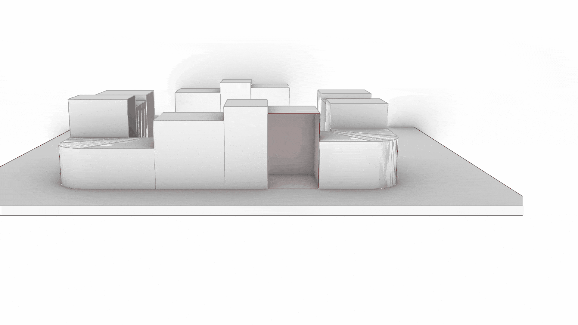 The process begins with simple rectilinear volumes arranged in a modular layout. Gradually, corner conditions are softened through curvature operations, and strategic voids are introduced to enhance permeability and circulation.