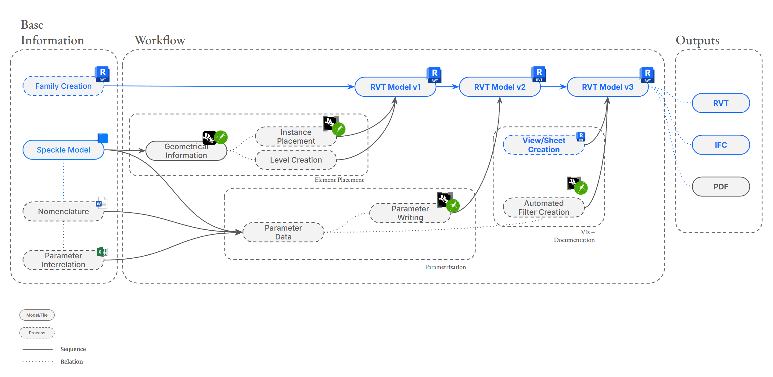The process begins with several key inputs: the parametric families developed by the data team, the shared Speckle model used by the studio for inspection and coordination, and a system of nomenclature defining how parameters and elements are named.