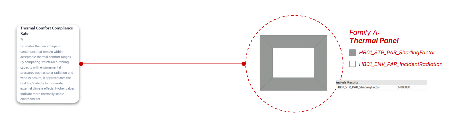 For the Thermal Comfort Compliance Rate, auxiliary box families are placed and color-coded according to the KPI formula. These elements read radiation and shading values from the panel families, making thermal behavior visible within the model.