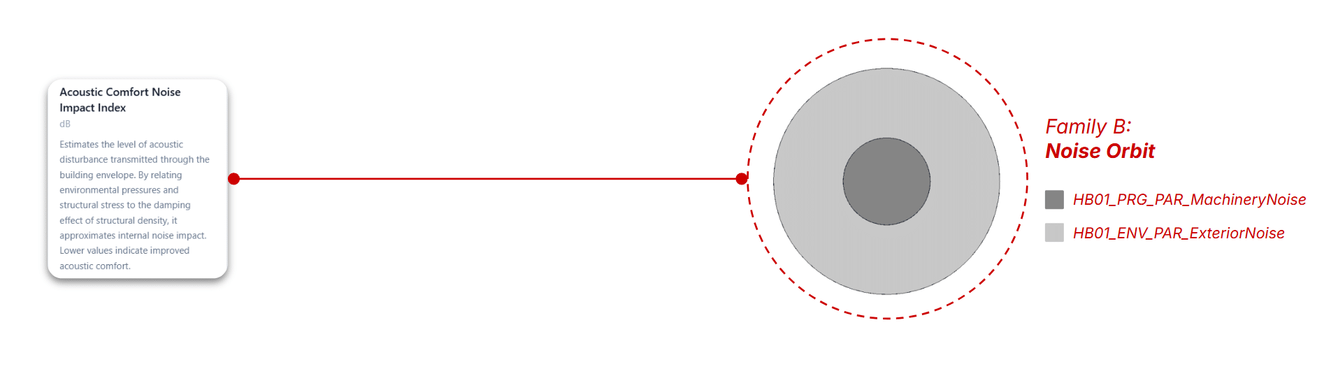 This KPI is represented through Family B: the Noise Orbit, a system of concentric geometries that encode both noise sources. The nested structure allows simultaneous visualization of individual values and overall acoustic impact.
