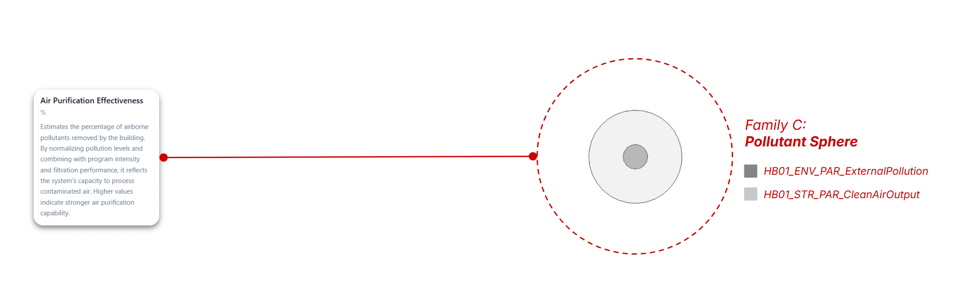 The Air Purification Effectiveness (APE) assesses the building’s capacity to filter polluted air by comparing external pollution levels with clean air output.