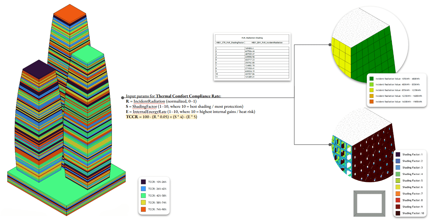 The Thermal Comfort Compliance Rate (TCCR) evaluates how effectively the building maintains acceptable thermal conditions by balancing incident solar radiation, shading capacity, and internal energy loads.
