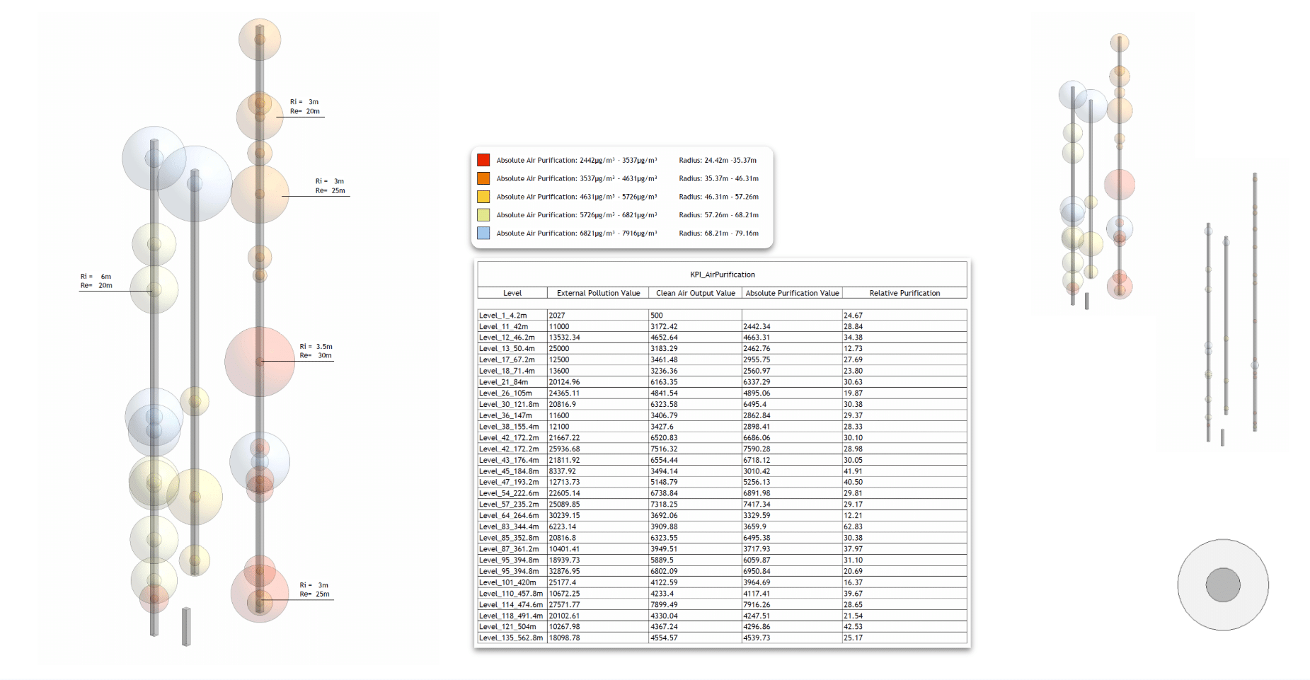 Finally, the Air Purification Effectiveness is represented through Pollutant Spheres placed at critical positions in the building. These spheres compare pollution intake with clean air output, visually highlighting areas where purification demand is highest.