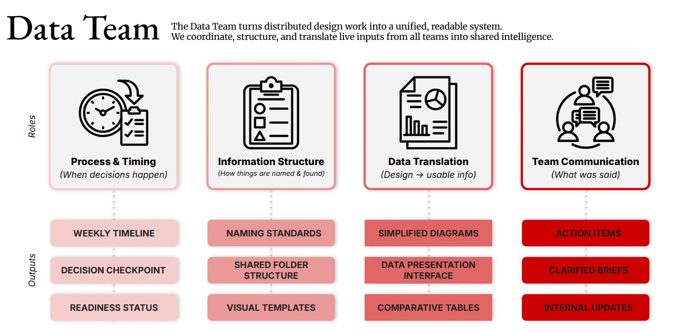 Unlike other teams in the studio, the data team does not generate architectural geometry. Instead, we function as a coordination layer, ensuring that the outputs of multiple teams remain aligned.