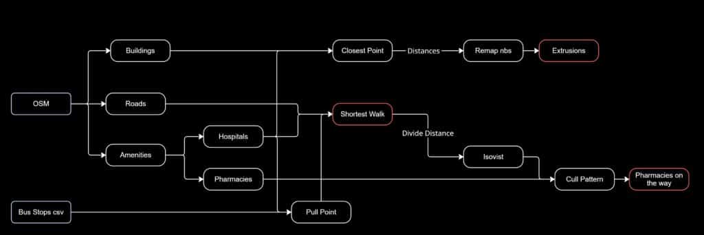 This project explores how computational design tools can be used to analyze and visualize urban accessibility in a more dynamic and data-driven way. Using Grasshopper as the main environment, we combined OpenStreetMap (OSM) data (roads, buildings, amenities) with an external dataset of bus stops to visualize healthcare connectivity in the urban context.