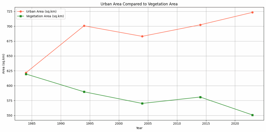 By calculating the proportion of pixels classified as “urban” in each image, we measured the percentage increase in built-up land over nearly four decades.