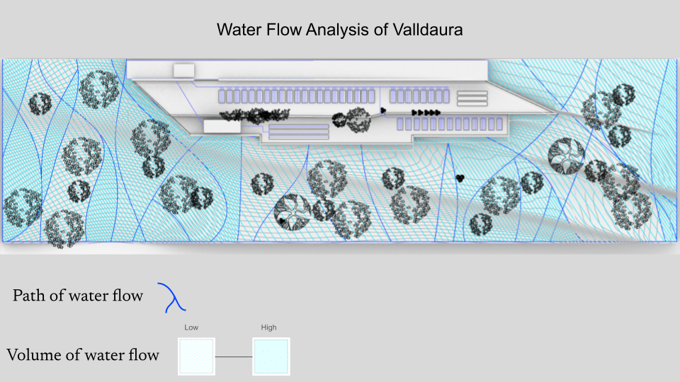 The focal point of the drawing is the flow of water, I did not want to draw attention to the terrace situated on the slope. However, I wanted a subtle point to the irrigation lines in the garden beds on the terrace, identifying them with the same dark blue that displays the path of natural water flow down the hill. The path of the water is dictated by the intensity of the slope and the vegetation on the hill that absorbs and slows. Similarly, the gradient of the hatched lighter blue lines depicts the volume of the water flow in regions which are also established by slope intensity and vegetation density. The path of water flow both acts as a directional indicator and the borders of water volume regions.
