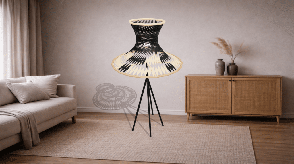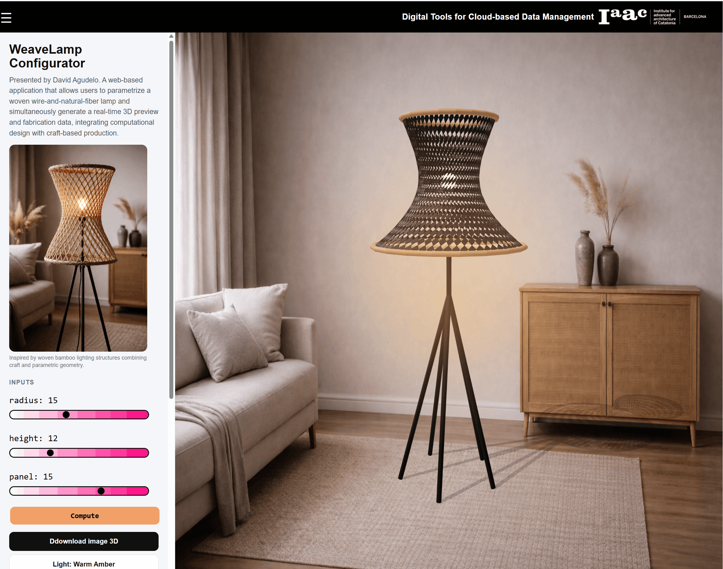 Through the browser, users can adjust parameters, compute geometry, review outputs, and evaluate the lamp in a styled 3D environment.